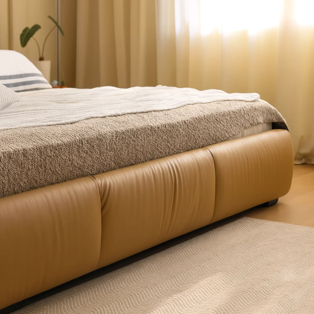 Эта кровать объединяет в себе надежность и комфорт премиального уровня. Основание изготовлено из прочной российской сосны и многослойной фанеры класса E0, дополнено металлическими элементами для устойчивости. Обивка выполнена из натуральной кожи высшего сорта, мягкой и долговечной. Наполнение сочетает гусиный пух, холлофайбер и пену различной плотности (40D, 34D, 30D), обеспечивая комфорт и поддержку. Ножки из благородного ясеня с золотистым оттенком придают модели изысканный и современный характер.