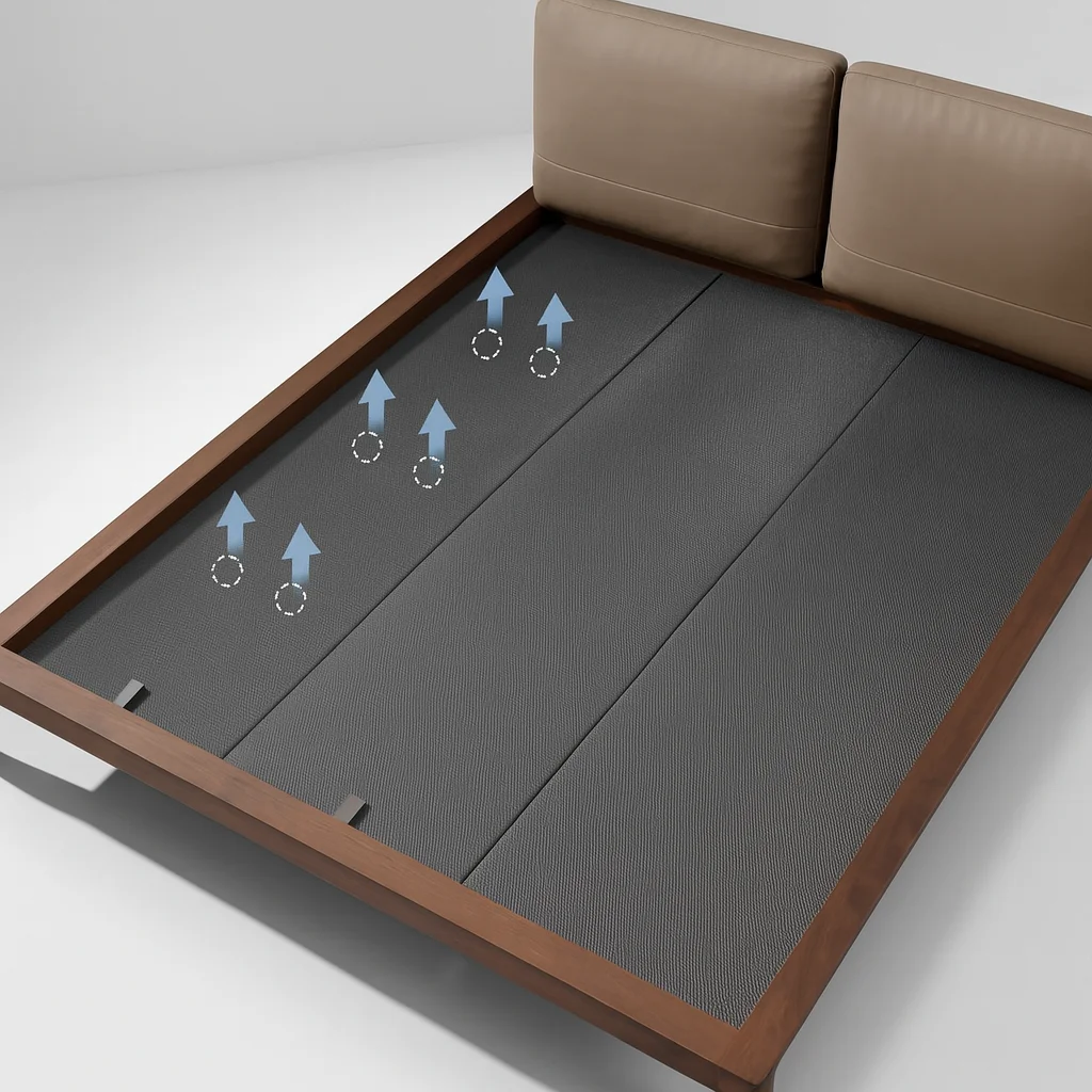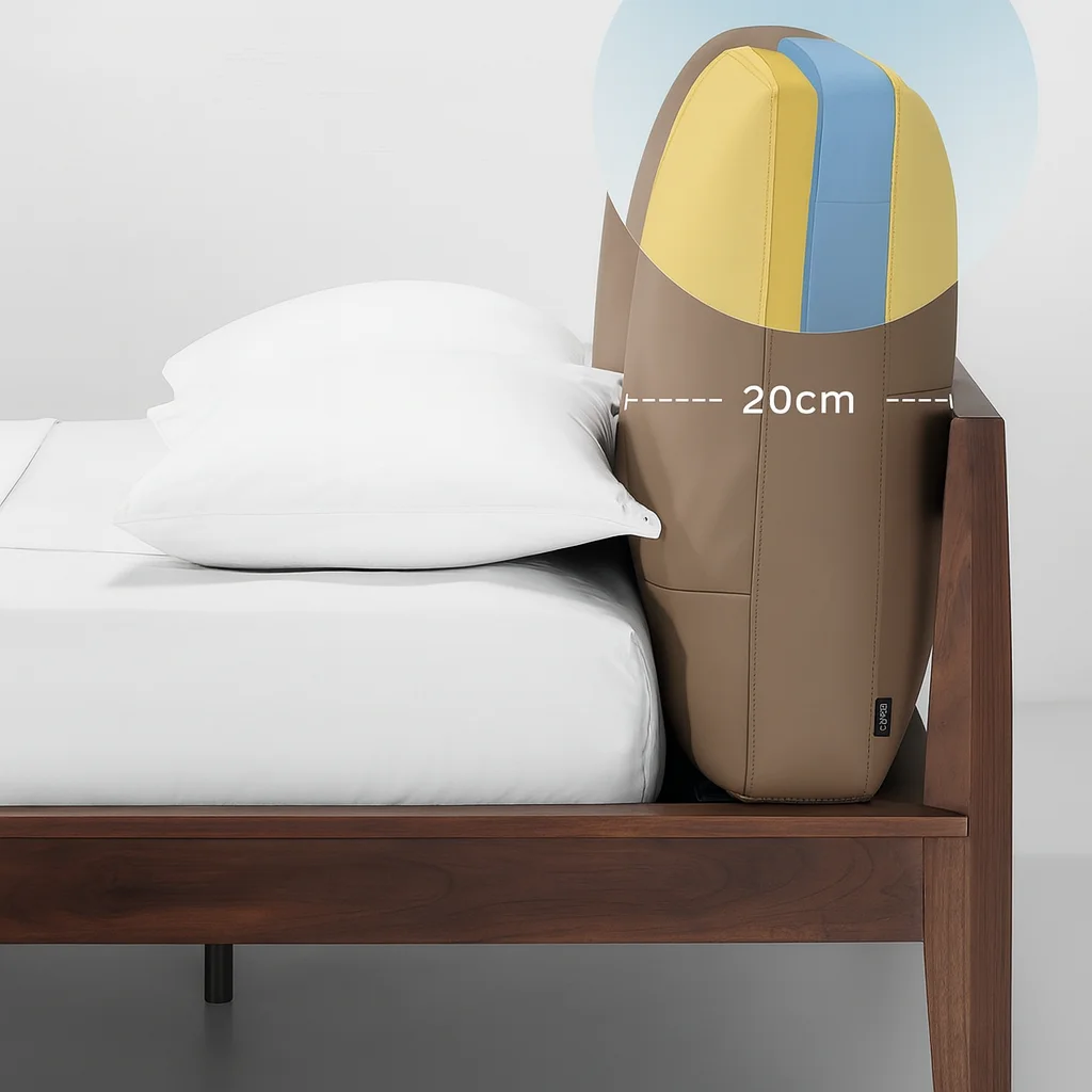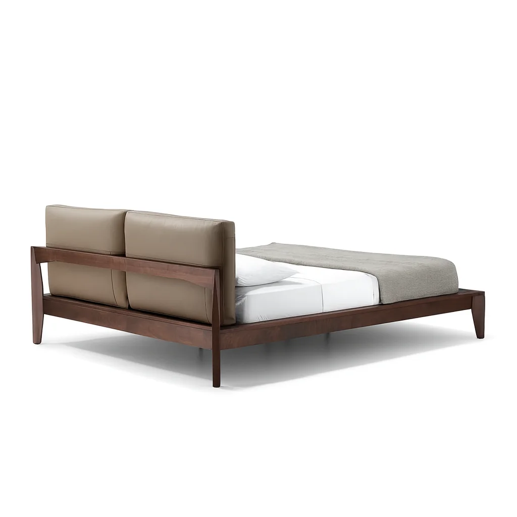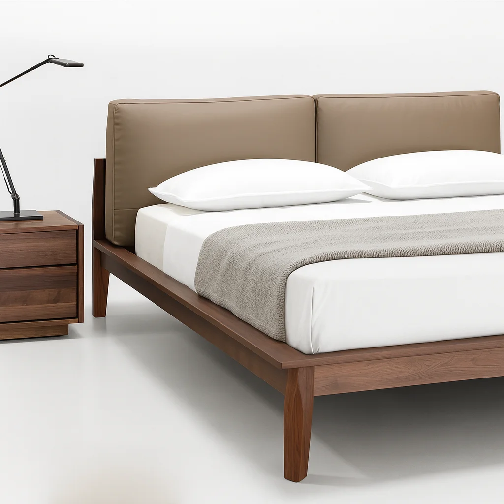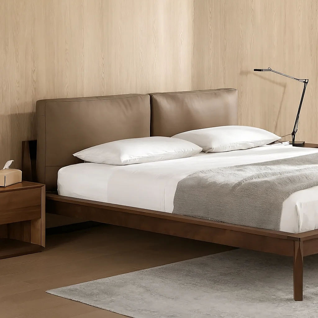 Сочетание премиальных материалов и утончённого стиля. Каркас выполнен из натурального массива: варианты — американский чёрный орех FAS-grade или американский белый ясень FAS. Спинка обита импортной натуральной кожей с тиснением, наполненной пером, шёлковым волокном и высокоэластичным поролоном, что обеспечивает мягкость и долговечность. Основание кровати изготовлено из многослойной фанеры для прочности. Экологичное PU-покрытие защищает древесину и подчеркивает её фактуру.