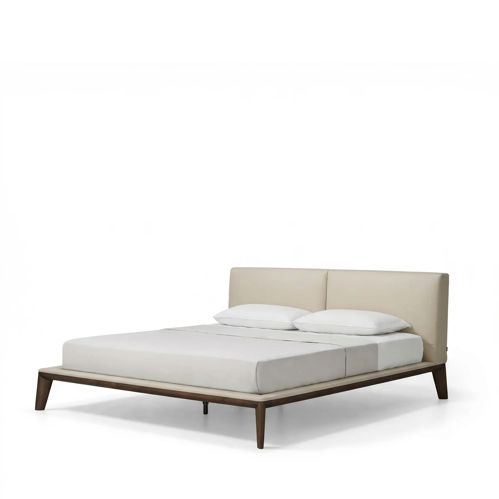 Эта кровать сочетает в себе натуральные материалы и современный минимализм. В обивке используется импортная кожа высшего сорта с тиснением, которая прочна, приятна на ощупь и сохраняет элегантный вид на долгие годы. Наполнение изголовья — мягкий поролон, обеспечивающий комфорт при опоре. Внутренний каркас выполнен из прочной российской сосны и многослойной фанеры, что гарантирует долговечность конструкции. Основание и ножки сделаны из североамериканского тёмного ореха — одной из самых ценных пород дерева, обладающей богатым оттенком и выразительной текстурой. Покрытие — экологичный PU-лак, защищающий поверхность.