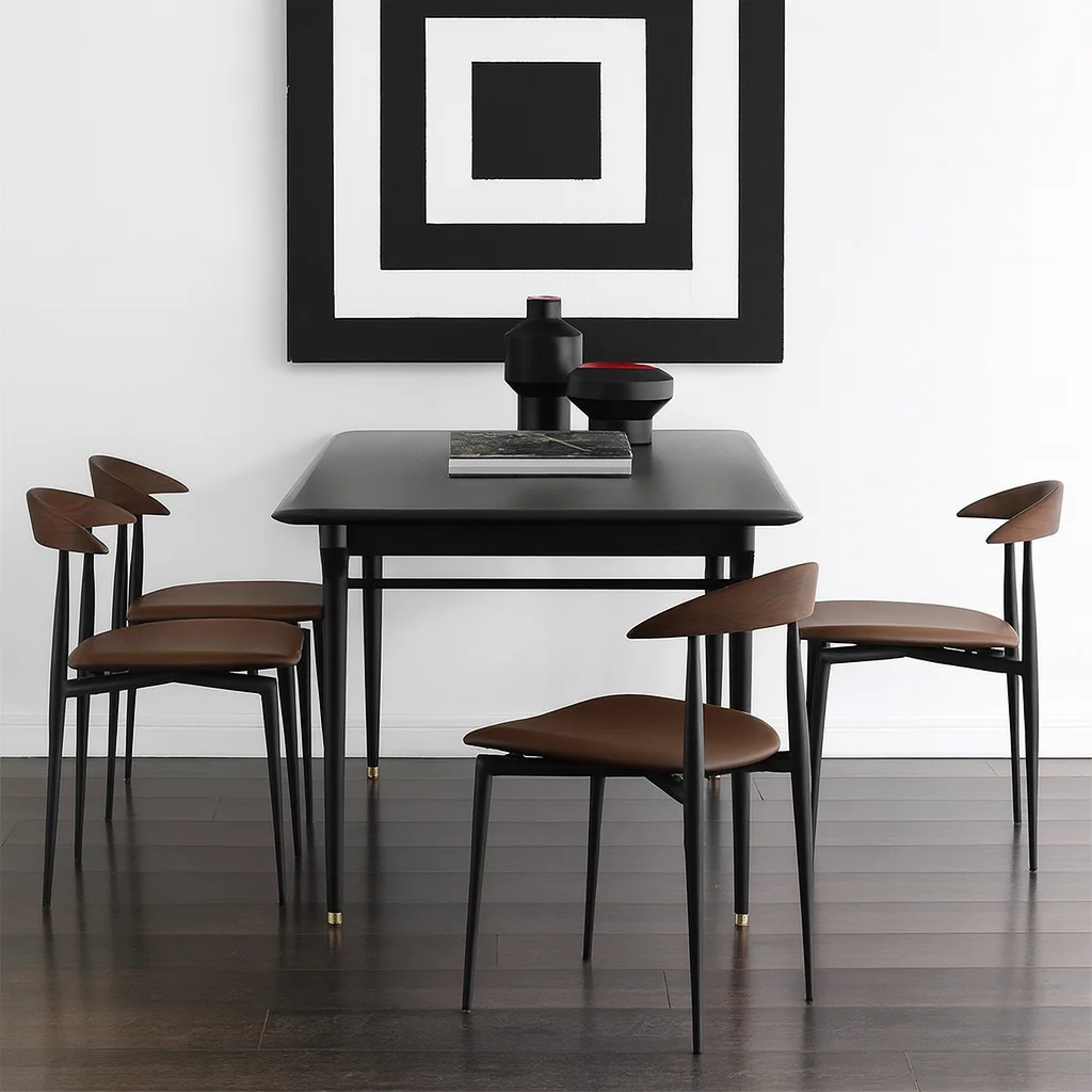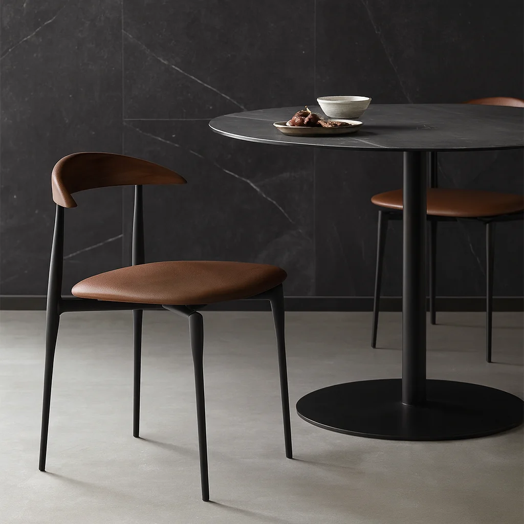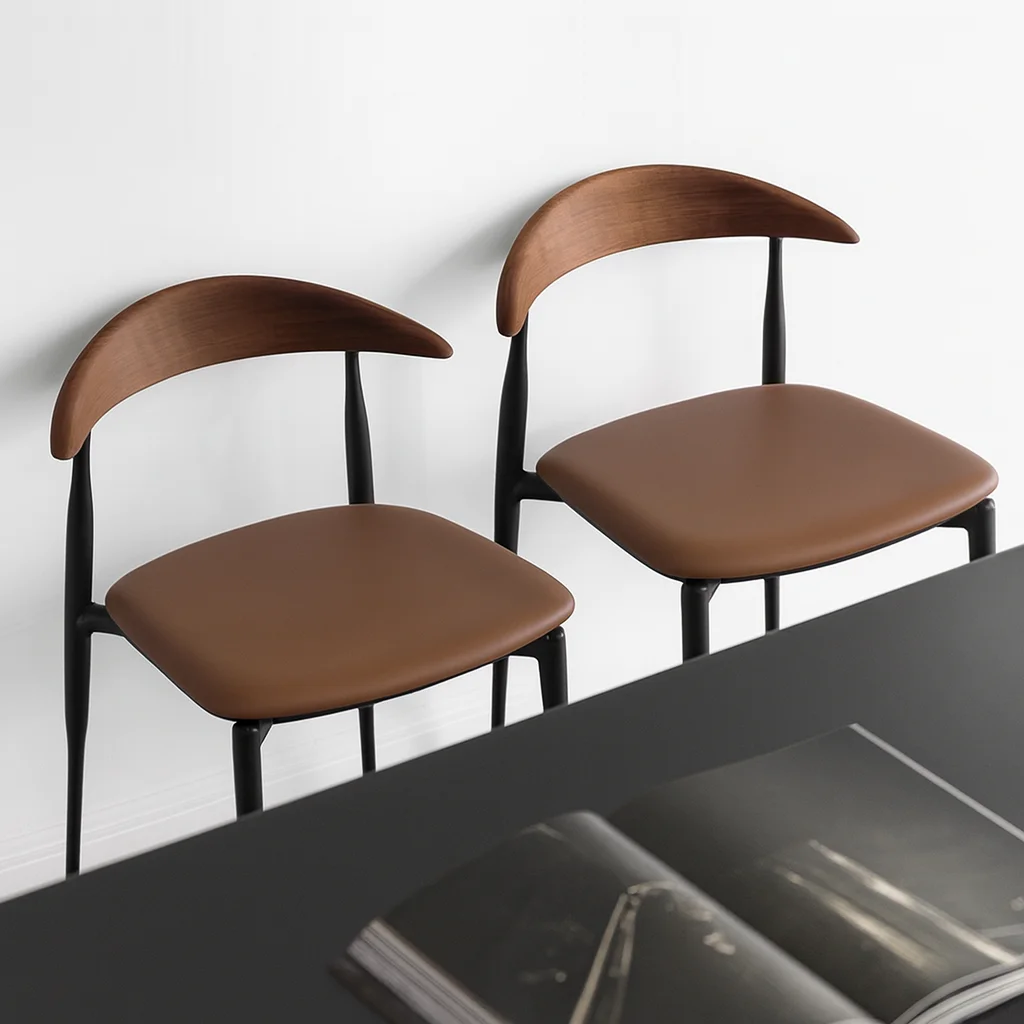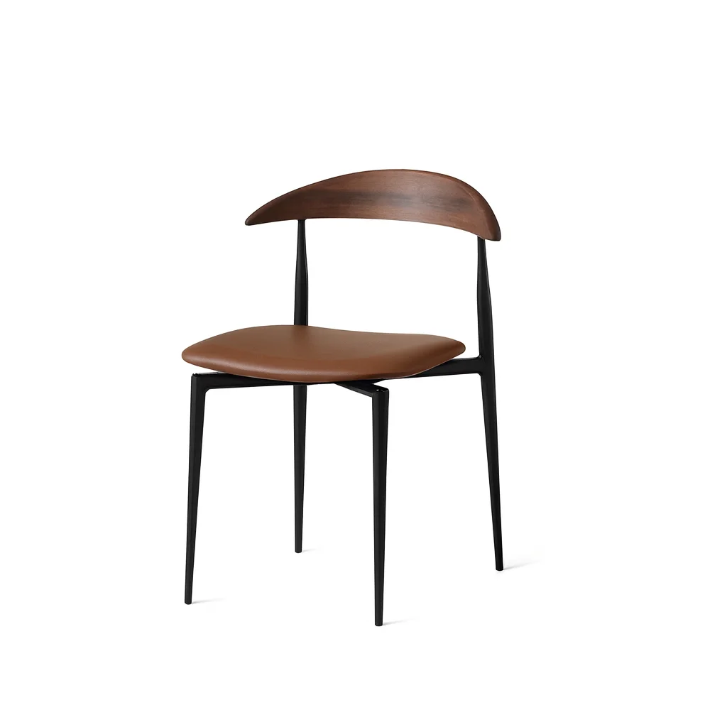 Стул RON сочетает в себе современный минимализм и надежность. Основание выполнено из прочного железного каркаса матового черного цвета, что придает изделию строгий и элегантный вид. Сиденье из высококачественной искусственной кожи с наполнением из поролона и синтепона обеспечивает комфорт. Для прочности и долговечности используется многослойная фанера класса Е0, а спинка отделана натуральным массивом ореха, который добавляет теплоту и натуральность в дизайн.