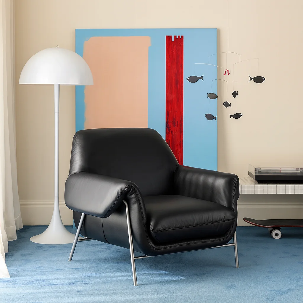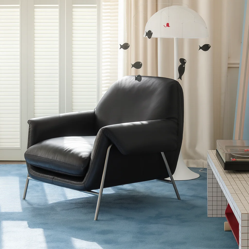 Элегантное кресло с обивкой из натуральной лицевой кожи и прочным каркасом из массива сосны и многослойной фанеры. Для упругости и долговечности используется система змеевидных пружин, а наполнение из высококачественного поролона разной плотности, хлопка и пера обеспечивает комфорт и анатомическую поддержку. Ножки выполнены из нержавеющей стали с матовой обработкой, что придаёт современный вид и устойчивость. Доступно в черном и абрикосовом цветах.