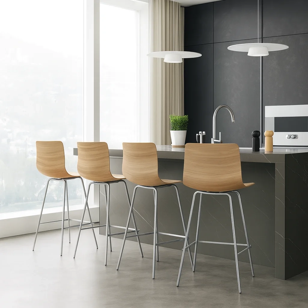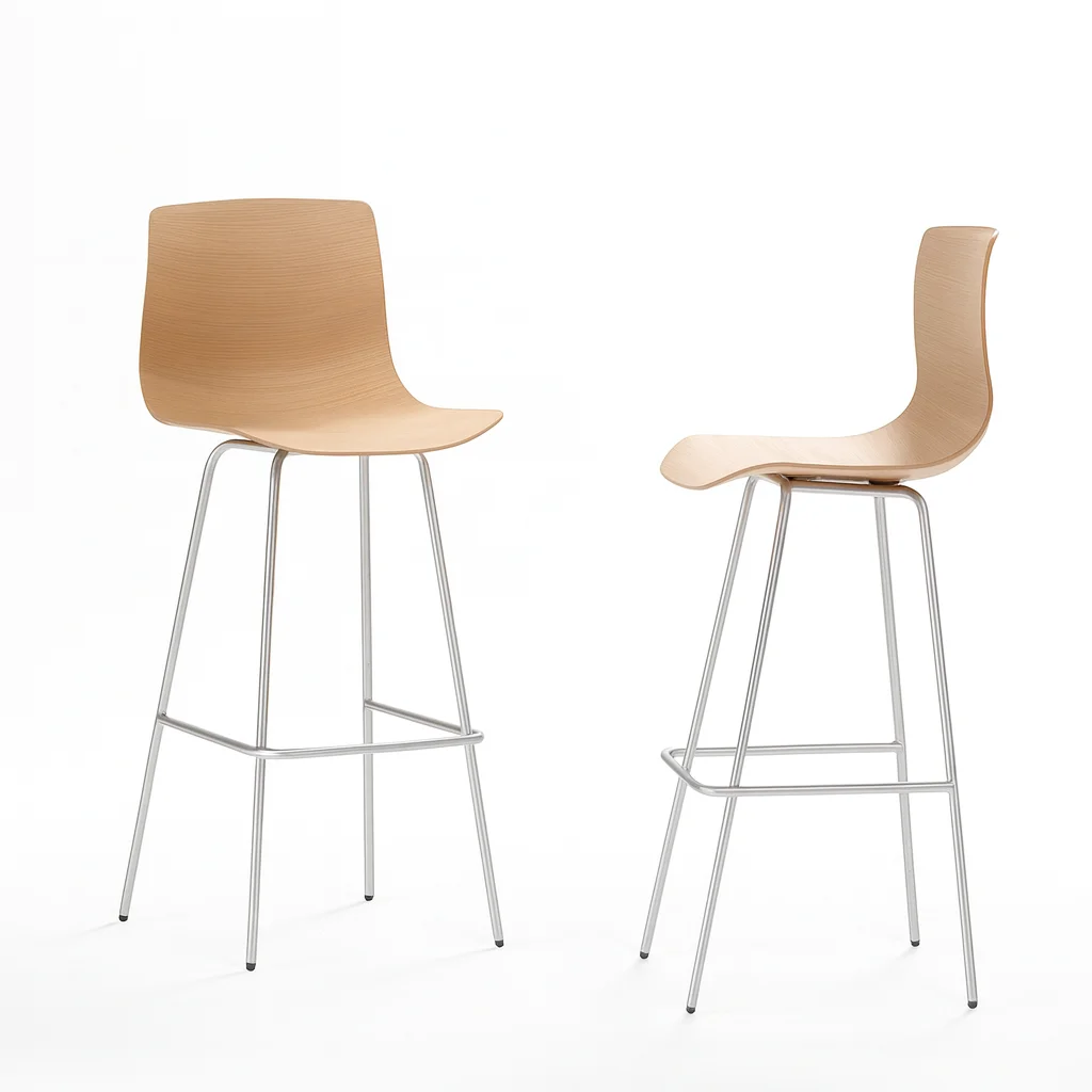 Современный барный стул, произведённый в Таиланде. Выполнен из фанеры с облицовкой шпоном ореха и установлен на прочные ножки из нержавеющей стали. Покрытие выполнено полиуретановой краской, обеспечивающей долговечность и защиту.