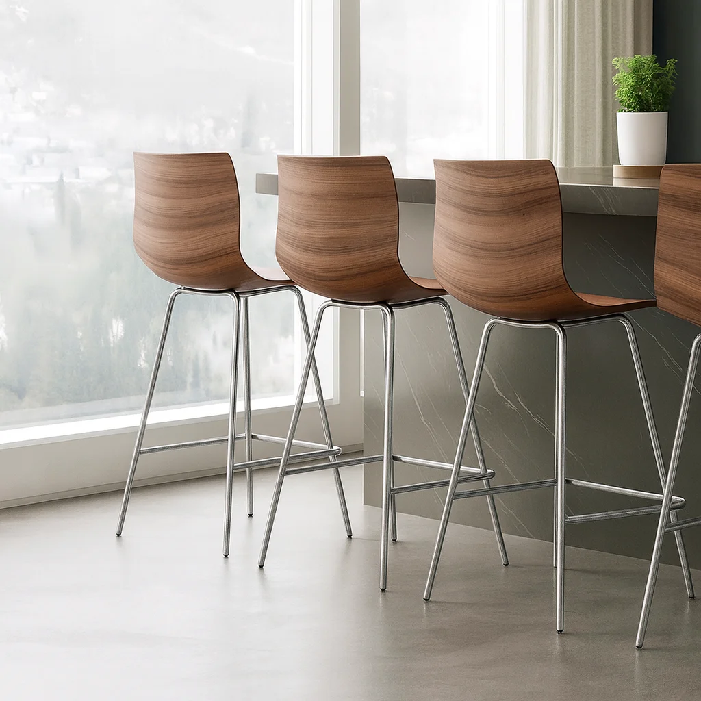 Современный барный стул, произведённый в Таиланде. Выполнен из фанеры с облицовкой шпоном ореха и установлен на прочные ножки из нержавеющей стали. Покрытие выполнено полиуретановой краской, обеспечивающей долговечность и защиту.