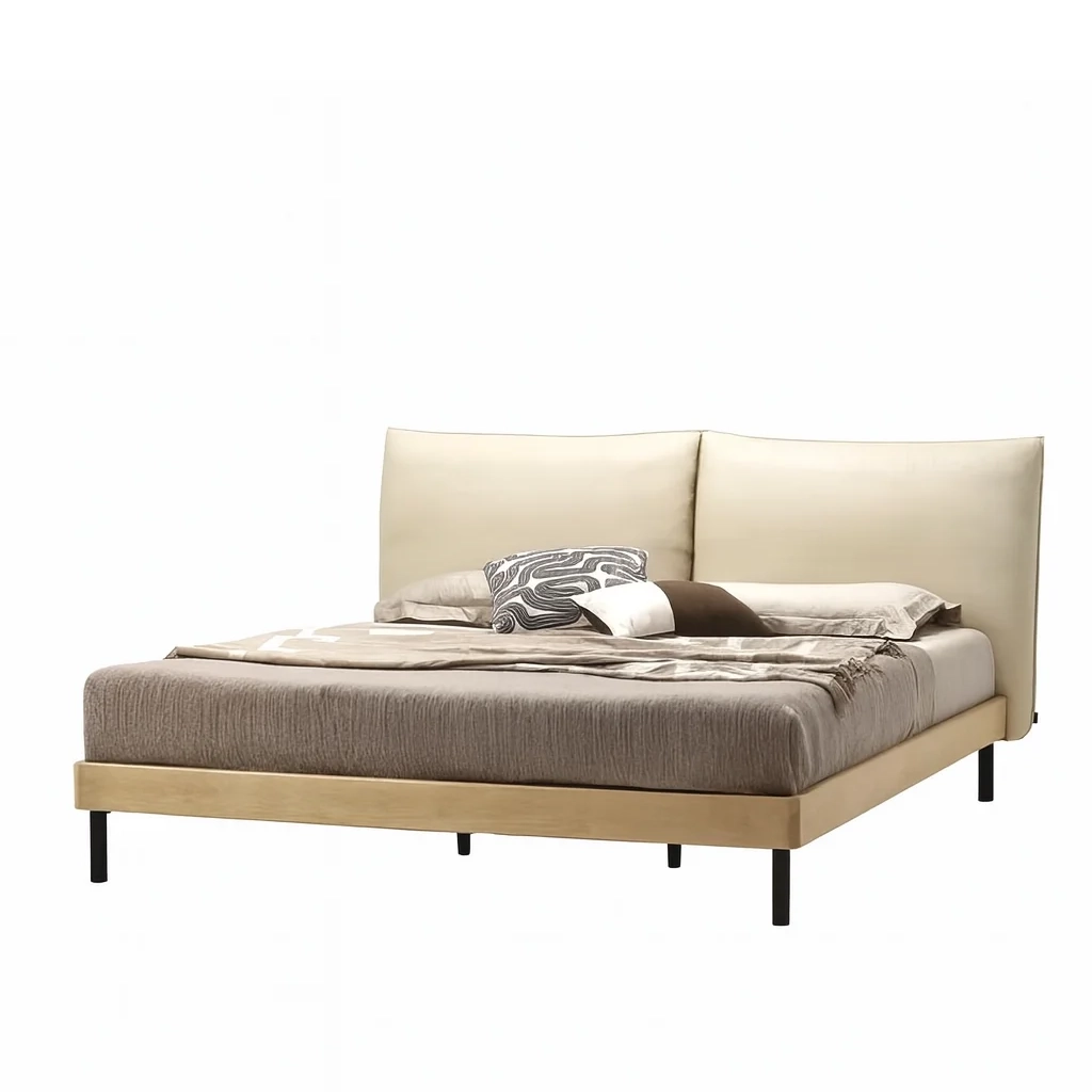 Эта модель сочетает натуральные материалы и современную конструкцию. Изголовье выполнено из натуральной кожи с мягким наполнением из хлопка, шёлкового волокна и многослойной фанеры, что создаёт комфортную поддержку. Каркас из ясеня придаёт конструкции прочность, а металлические ножки добавляют лёгкости и визуальной динамики. Основание из многослойной древесины класса E0 с антискользящим покрытием обеспечивает надёжность и долговечность