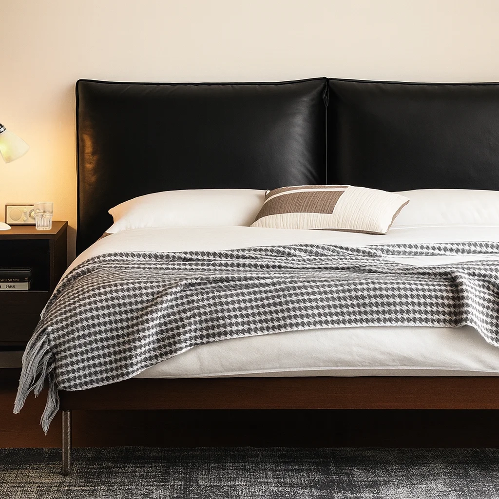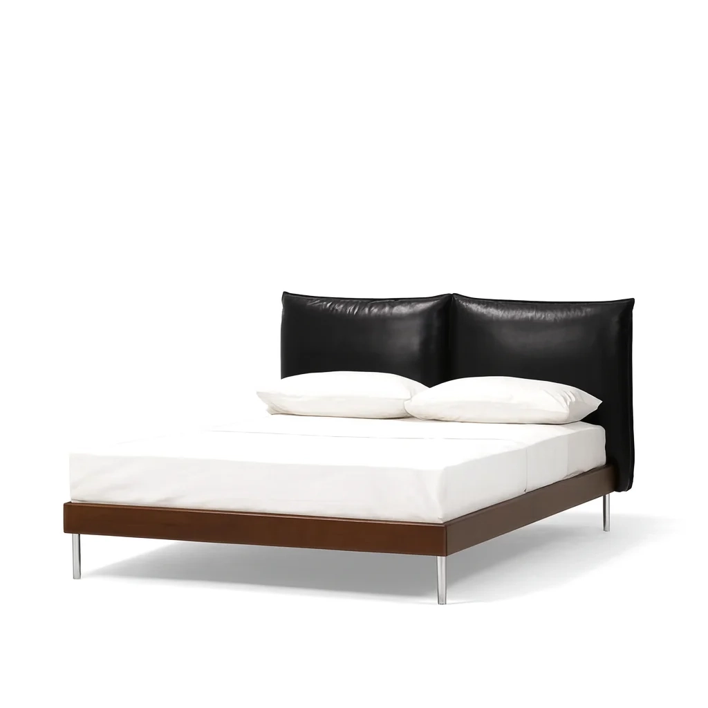 Эта модель сочетает натуральные материалы и современную конструкцию. Изголовье выполнено из натуральной кожи с мягким наполнением из хлопка, шёлкового волокна и многослойной фанеры, что создаёт комфортную поддержку. Каркас из ясеня придаёт конструкции прочность, а металлические ножки добавляют лёгкости и визуальной динамики. Основание из многослойной древесины класса E0 с антискользящим покрытием обеспечивает надёжность и долговечность