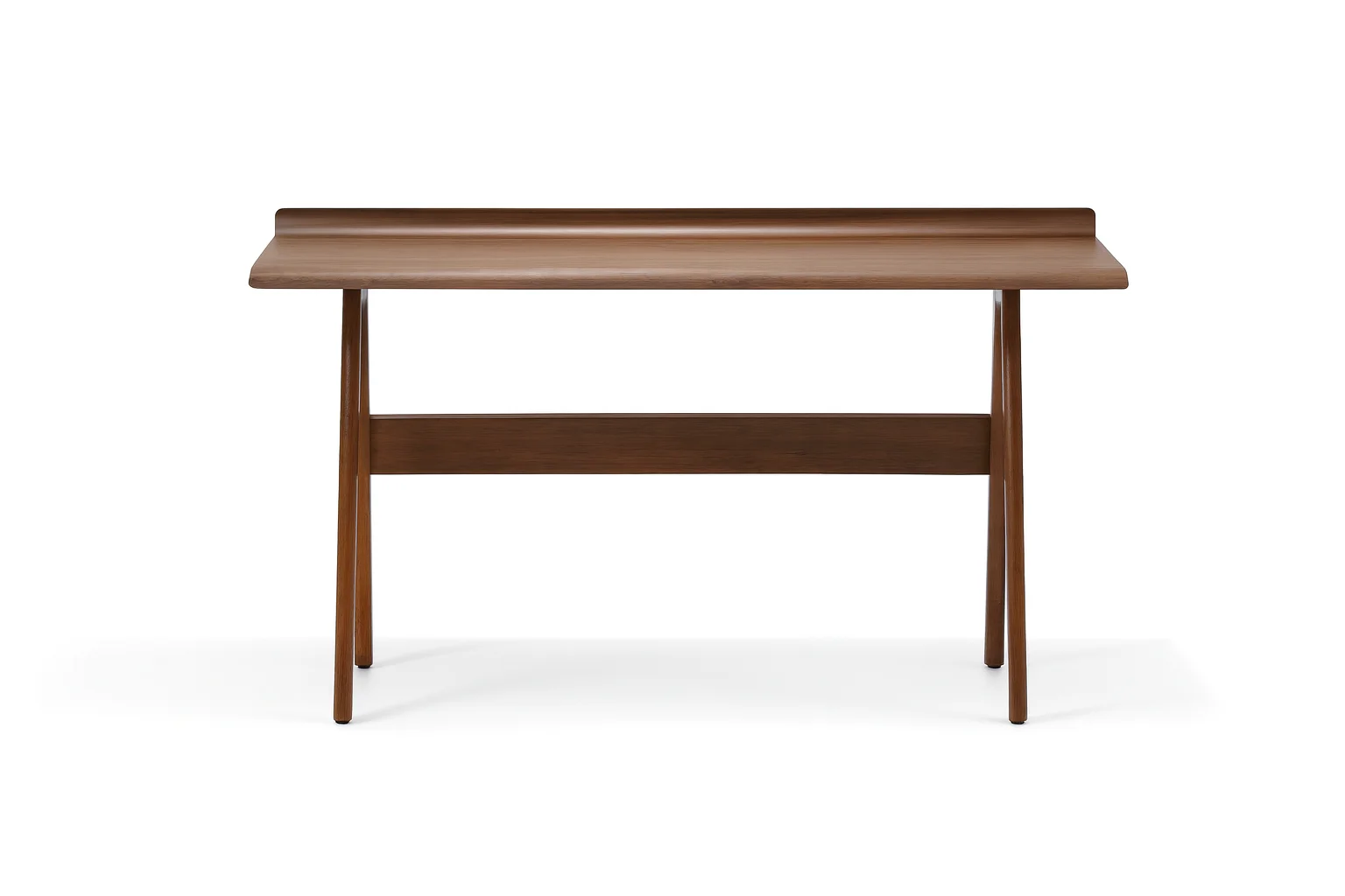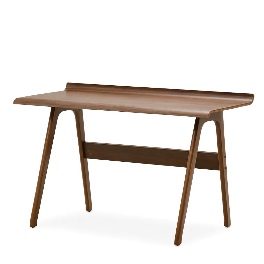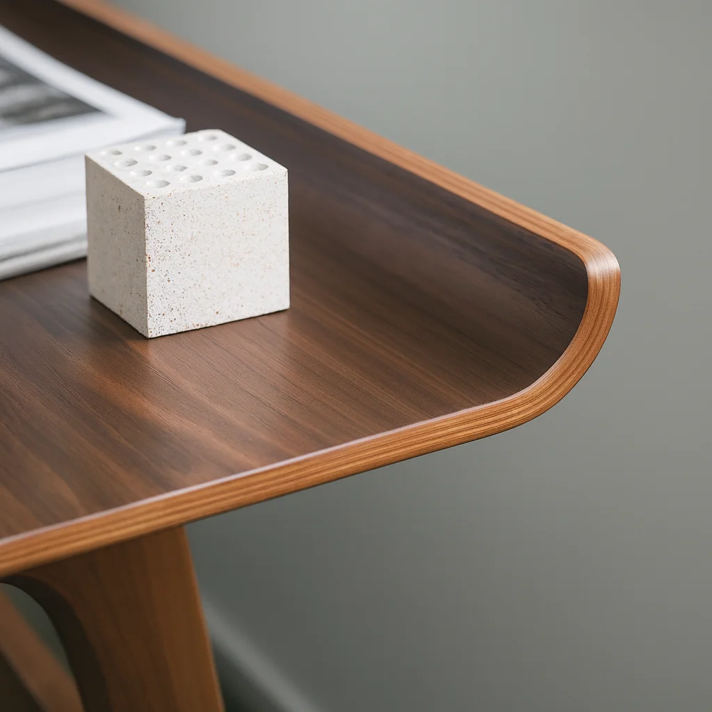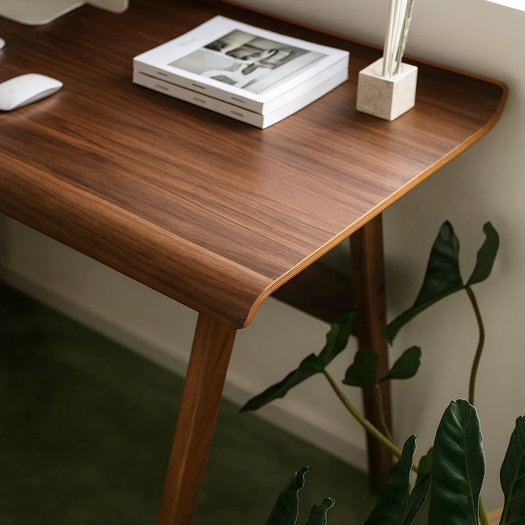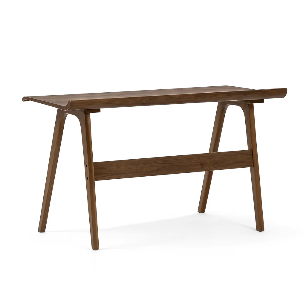 Стол REVA сочетает лёгкость современного силуэта и утончённую теплоту натурального дерева. Мягкий изгиб столешницы придаёт конструкции визуальную плавность, а аккуратная перекладина подчеркивает архитектурный баланс формы. Модель представлена в двух вариантах: глубокий чёрный с оттенком графита и тёплый орех с живой древесной текстурой. Лаконичный и функциональный, этот стол идеально подойдёт для рабочего пространства или творческой студии, добавляя интерьеру ощущение спокойной сосредоточенности.