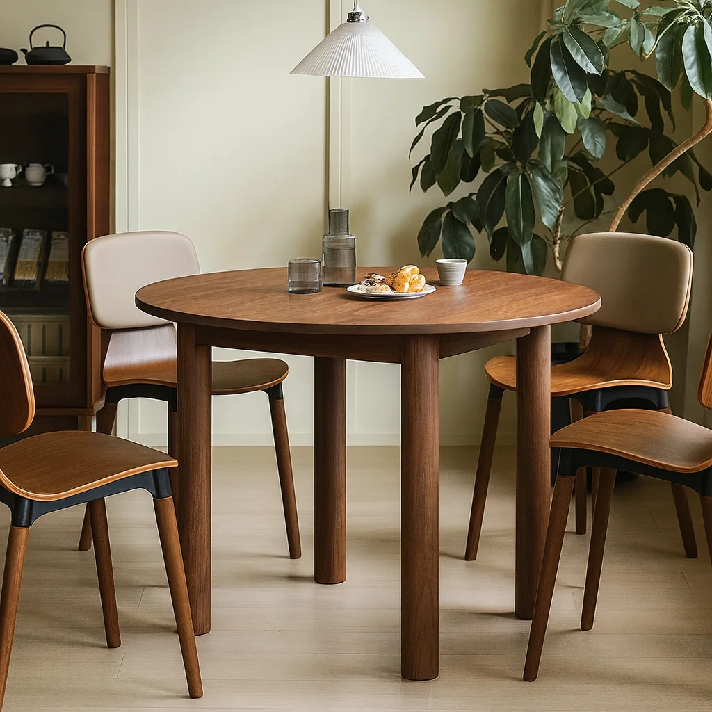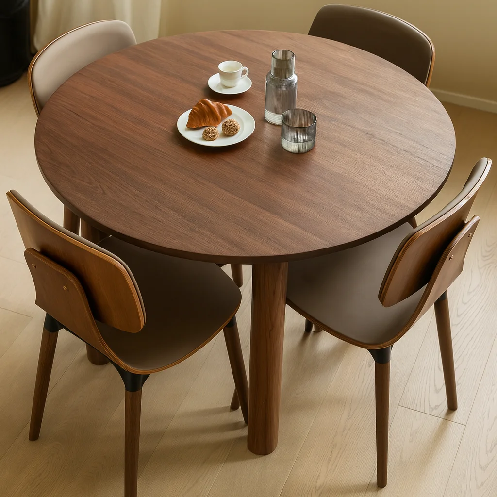 Круглый стол KL02 воплощает ясность формы и выразительность натурального дерева. Его лаконичная геометрия и мягкий профиль столешницы придают ощущение устойчивости и спокойствия. Версия из красного дуба излучает тепло и естественный уют, тогда как вариант из тёмного ореха создаёт атмосферу глубины и сдержанной элегантности. Толстая круглая столешница и ровные цилиндрические ножки создают гармонию пропорций — это универсальный предмет, который одинаково уместен и в современной гостиной, и в классическом интерьере.