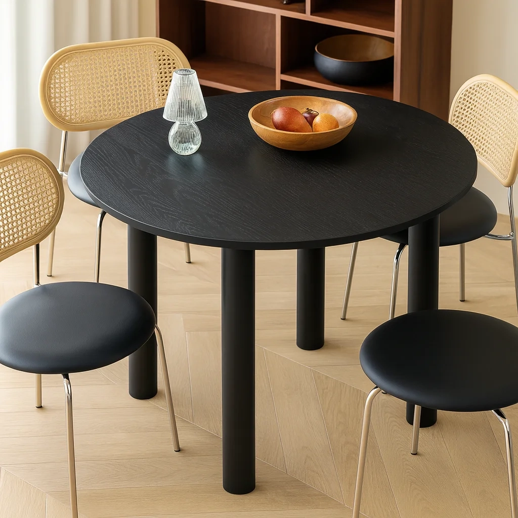 Круглый стол KL02 воплощает ясность формы и выразительность натурального дерева. Его лаконичная геометрия и мягкий профиль столешницы придают ощущение устойчивости и спокойствия. Версия из красного дуба излучает тепло и естественный уют, тогда как вариант из тёмного ореха создаёт атмосферу глубины и сдержанной элегантности. Толстая круглая столешница и ровные цилиндрические ножки создают гармонию пропорций — это универсальный предмет, который одинаково уместен и в современной гостиной, и в классическом интерьере.