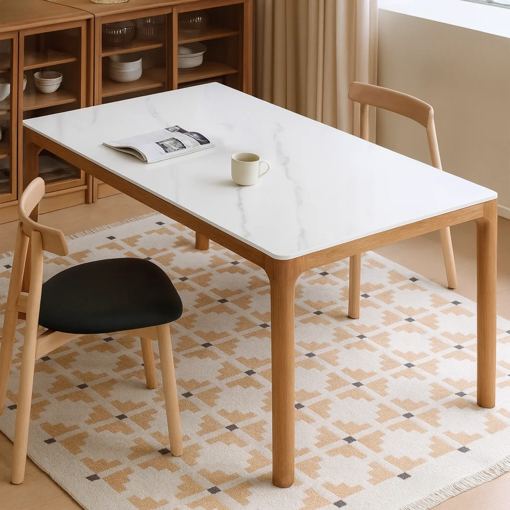 Обеденный стол YUEYAN STONE — это современная интерпретация минимализма в его самой чистой форме. Простая геометрия, утончённые линии и сбалансированные пропорции делают его универсальным элементом пространства. Холодная каменная поверхность придаёт образу визуальную лёгкость и монолитную прочность, а каркас из массива натурального дерева создаёт тёплый контраст. Светлый вариант сочетает белую каменную столешницу с тоном натурального бука, в то время как чёрный — строгий и выразительный, с глубокой фактурой красного дуба.