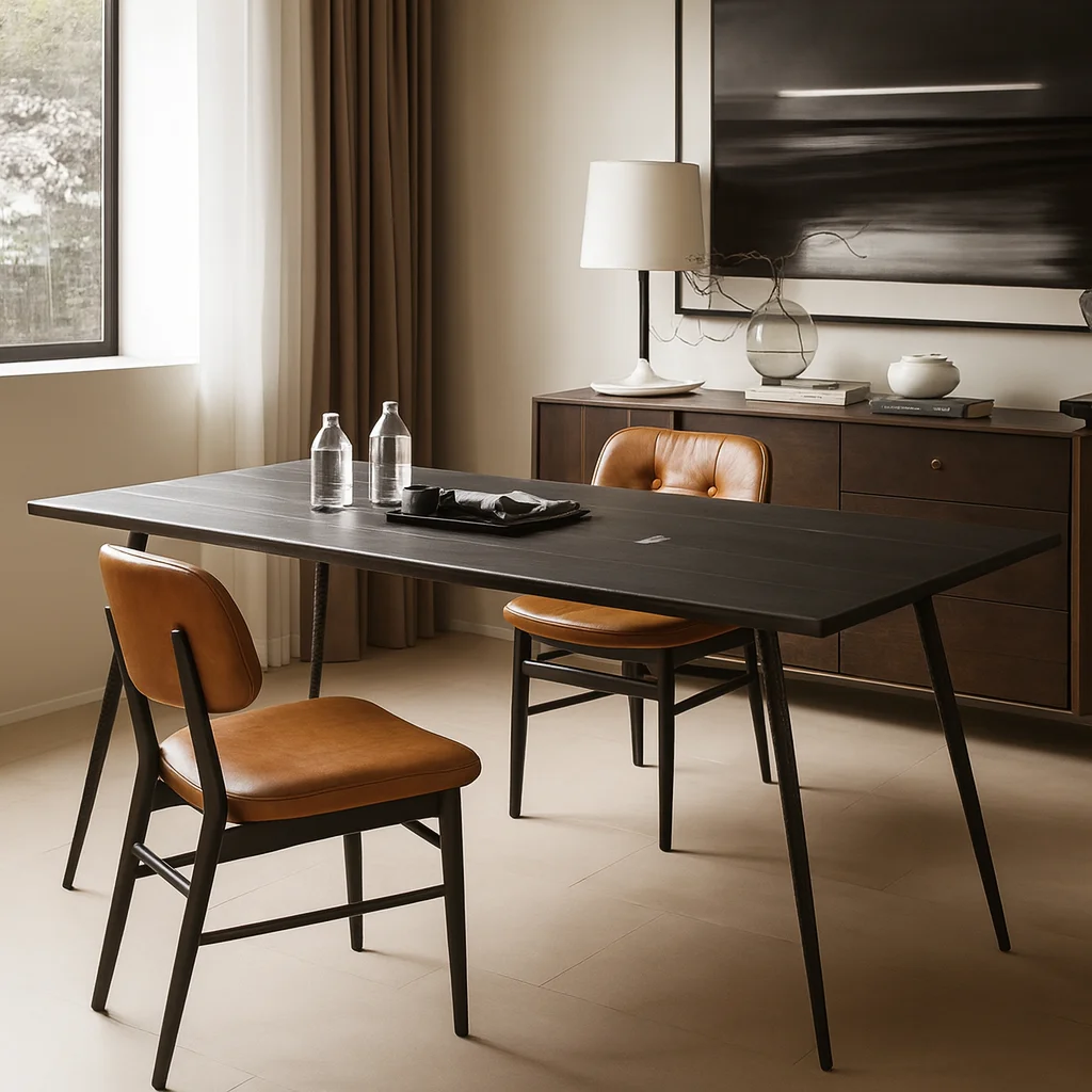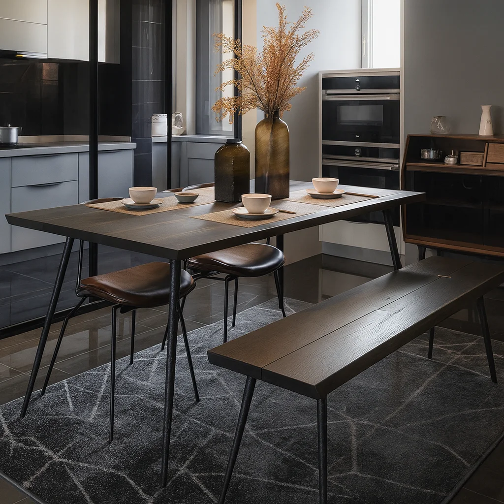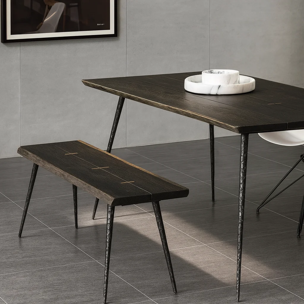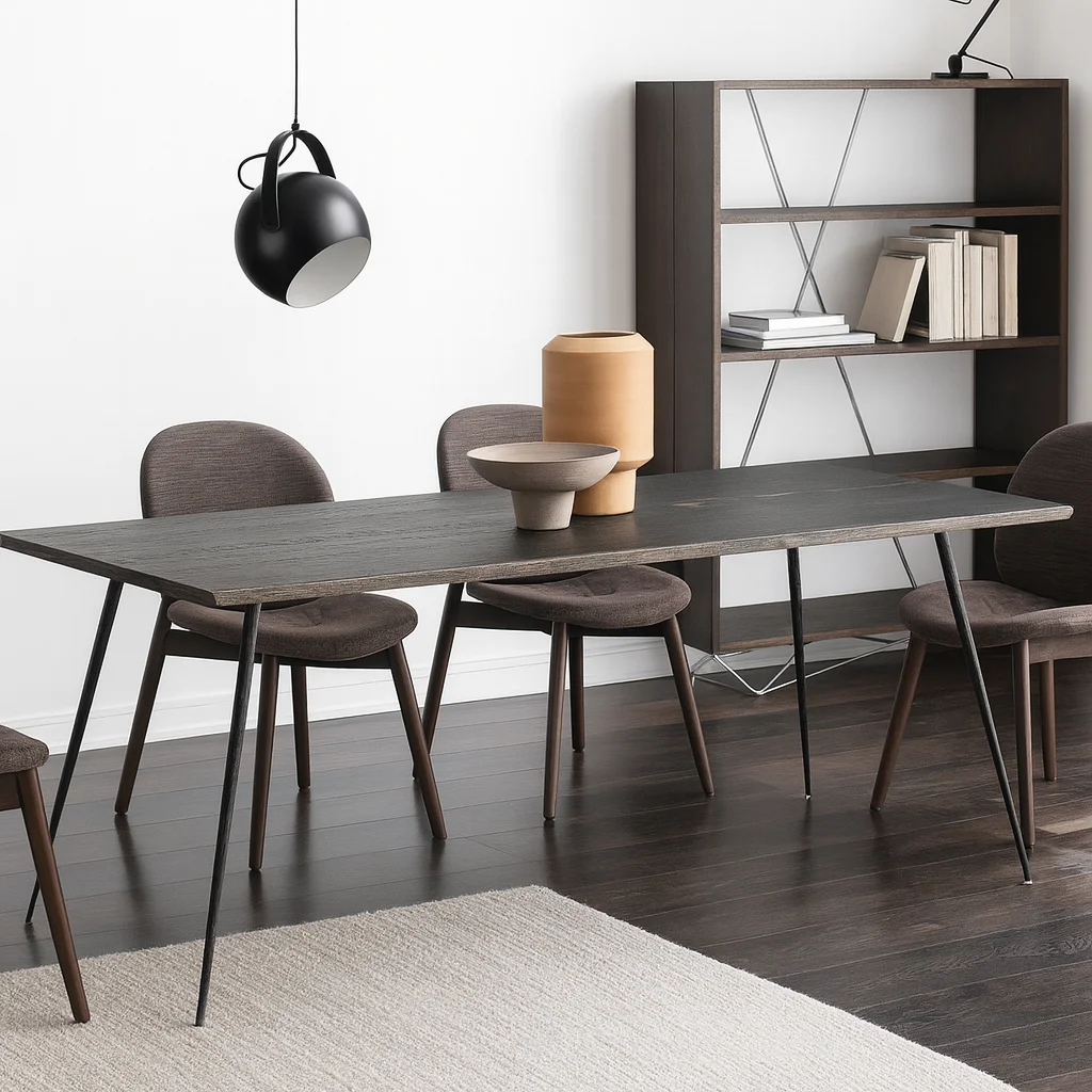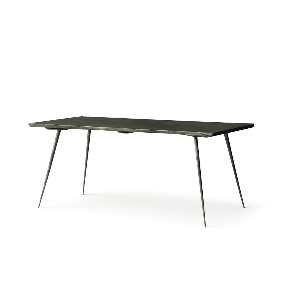 Стол NEXA сочетает лёгкость и индустриальный характер. Тонкая столешница из французского ясеня в дымчатом оттенке гармонично сочетается с металлическими ножками — в чёрном или золотистом исполнении. Сдержанная геометрия и визуальная лёгкость делают этот стол универсальным решением для современных интерьеров.