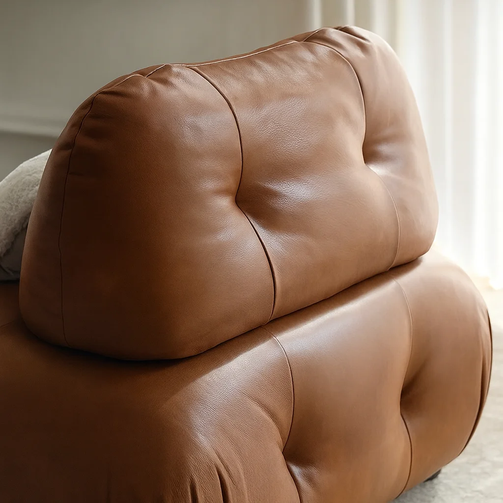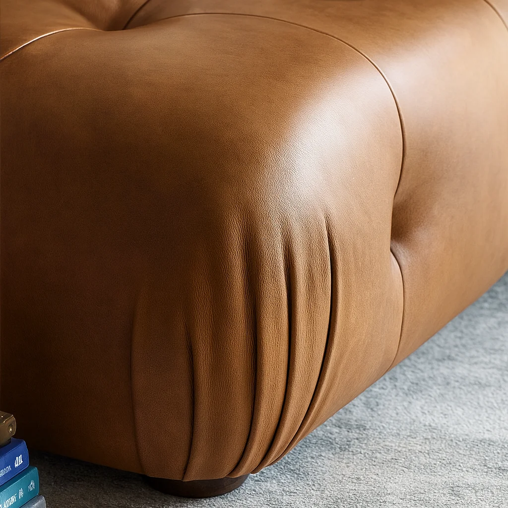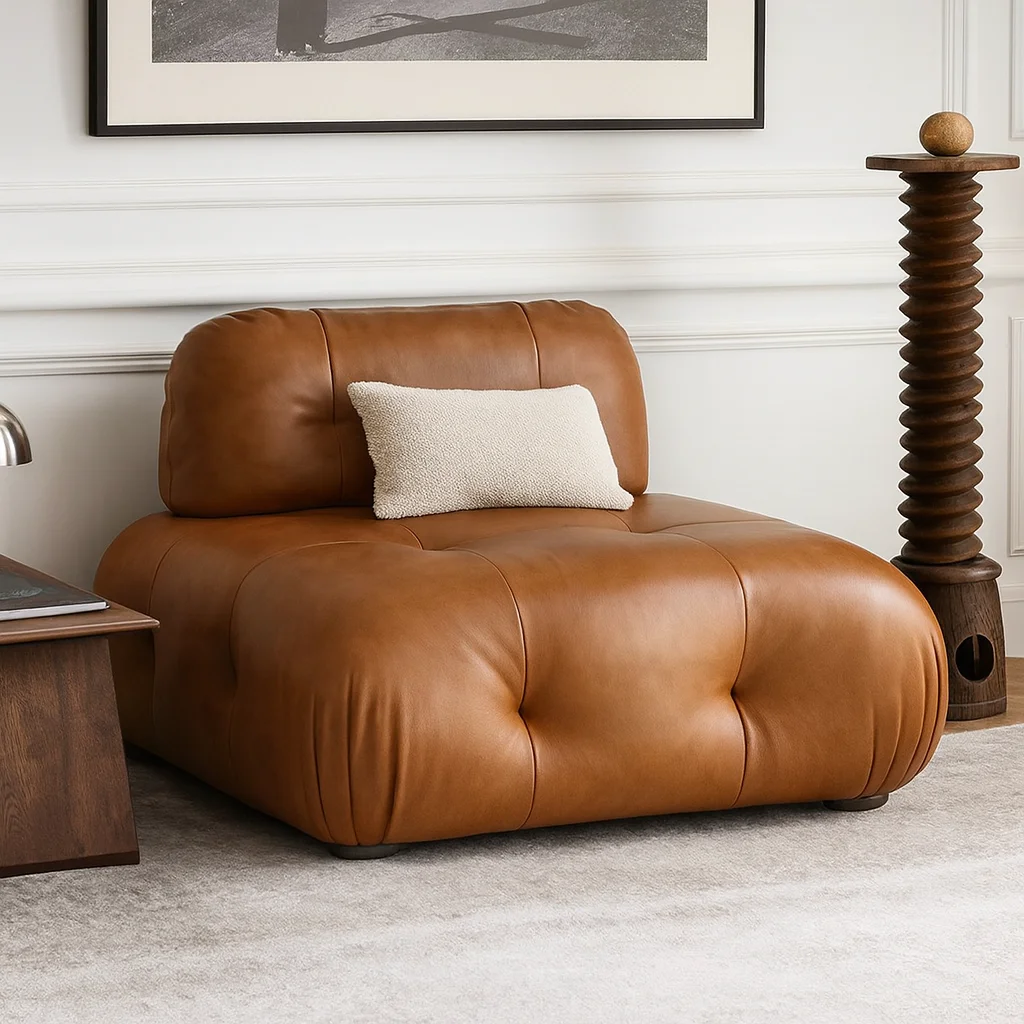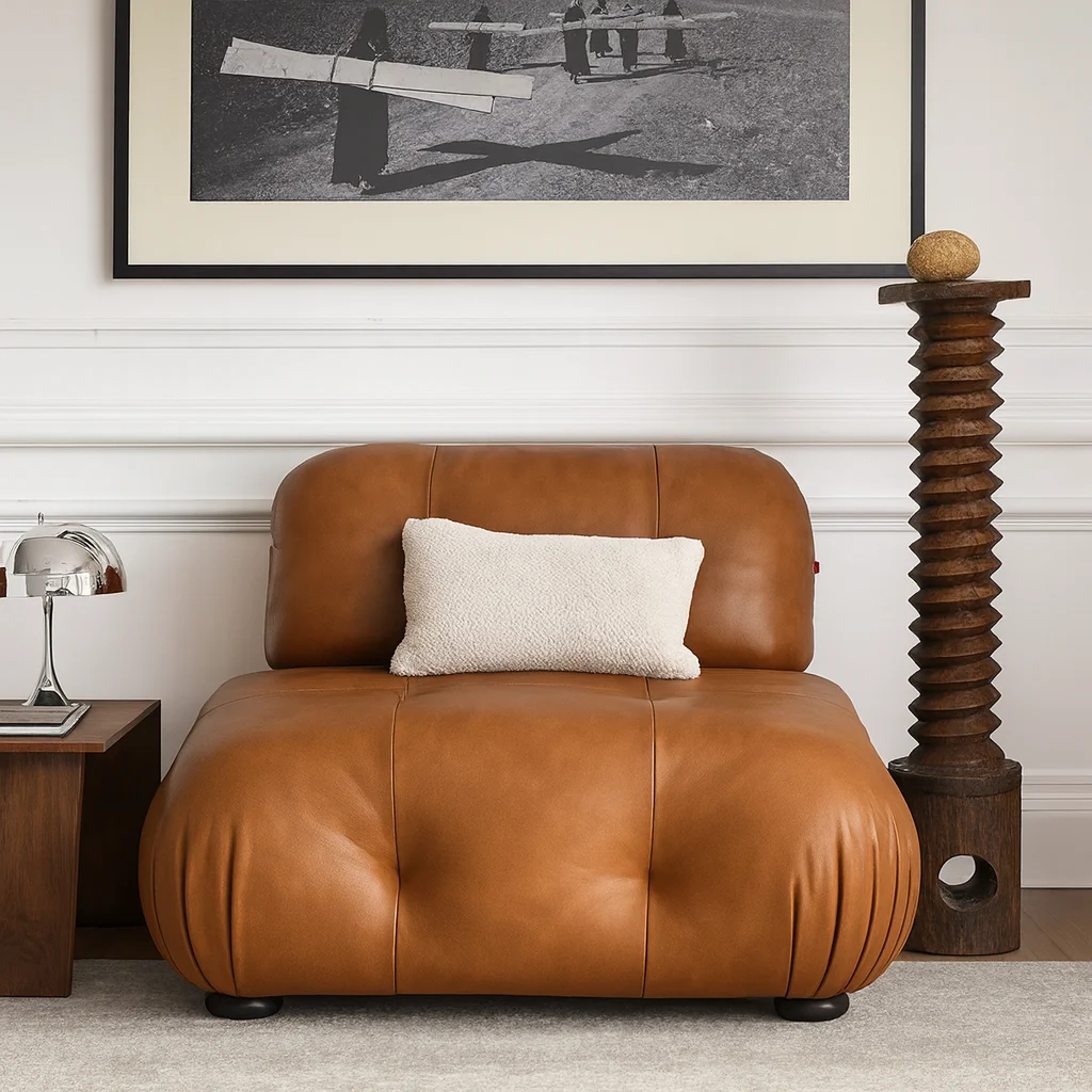 Модульный диван «CHLOE» воплощает мягкую монументальность и уют. Объёмная форма с глубокими утяжками и гладкой кожей создаёт ощущение уюта и защищённости. Лаконичная геометрия подчёркивает премиальную фактуру натуральной кожи и делает этот модуль самостоятельным акцентом в интерьере.