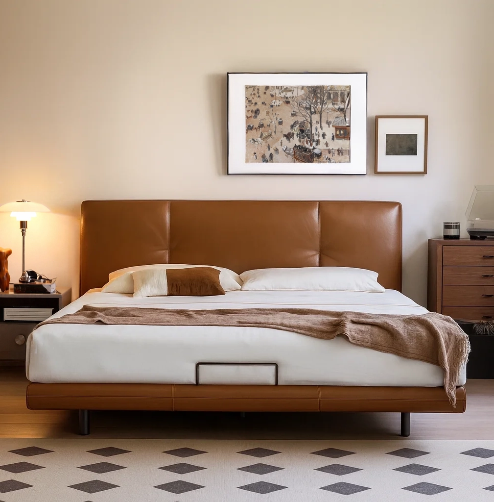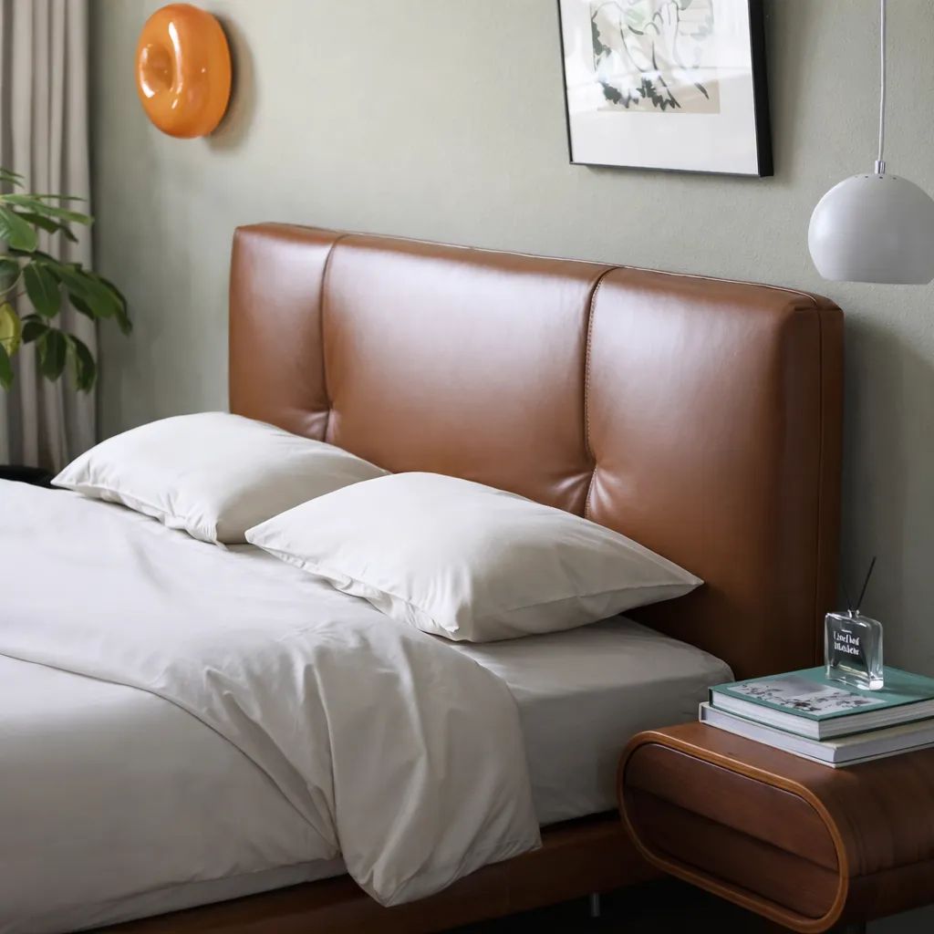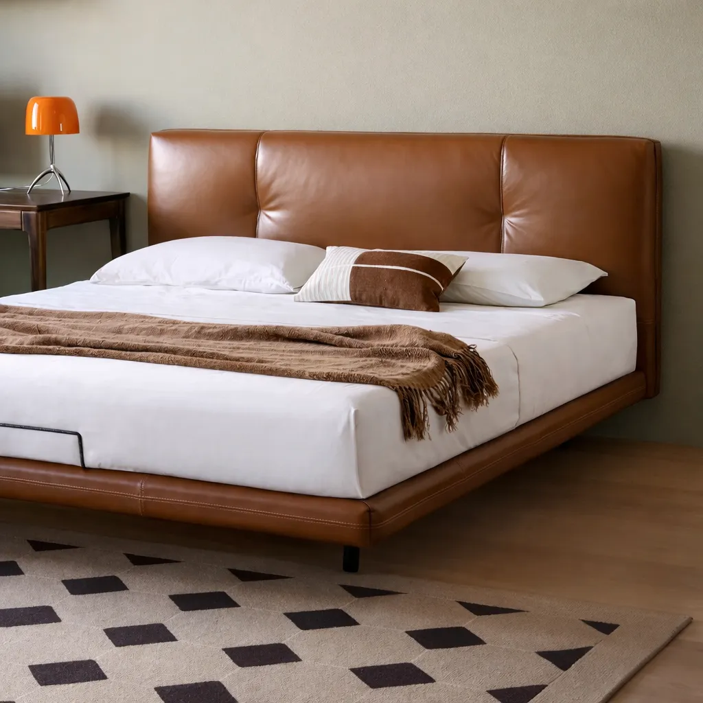 Данная кровать сочетает в себе современную эстетику и продуманную функциональность. Каркас выполнен из прочной древесины и усилен металлической основой, что гарантирует долговечность. Изголовье и боковые элементы отделаны натуральной кожей, дополненной мягким наполнением для комфорта. Тщательно подобранные материалы — от многослойной древесины до эластичной пены и хлопкового волокна — обеспечивают устойчивость, надежность и приятные тактильные ощущения.