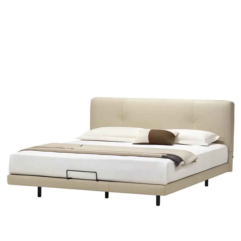 Данная кровать сочетает в себе современную эстетику и продуманную функциональность. Каркас выполнен из прочной древесины и усилен металлической основой, что гарантирует долговечность. Изголовье и боковые элементы отделаны натуральной кожей, дополненной мягким наполнением для комфорта. Тщательно подобранные материалы — от многослойной древесины до эластичной пены и хлопкового волокна — обеспечивают устойчивость, надежность и приятные тактильные ощущения.
