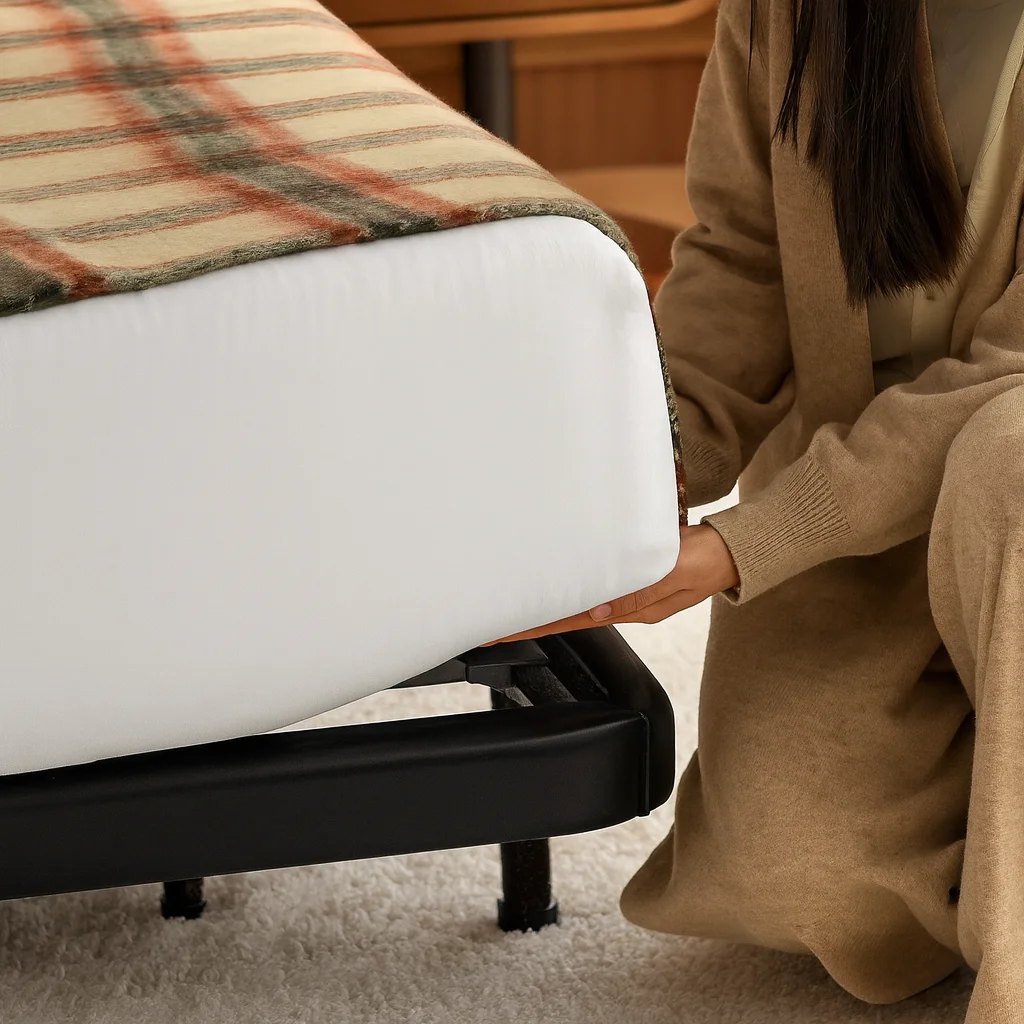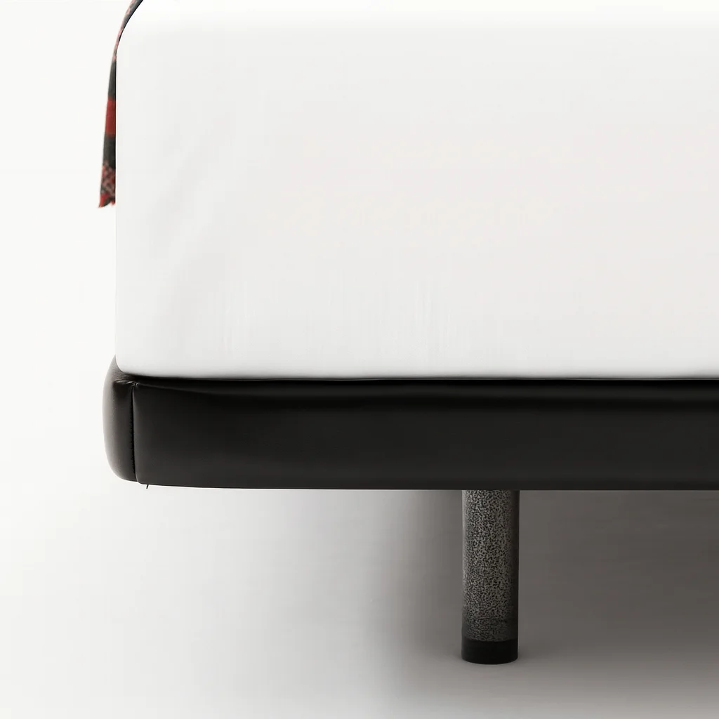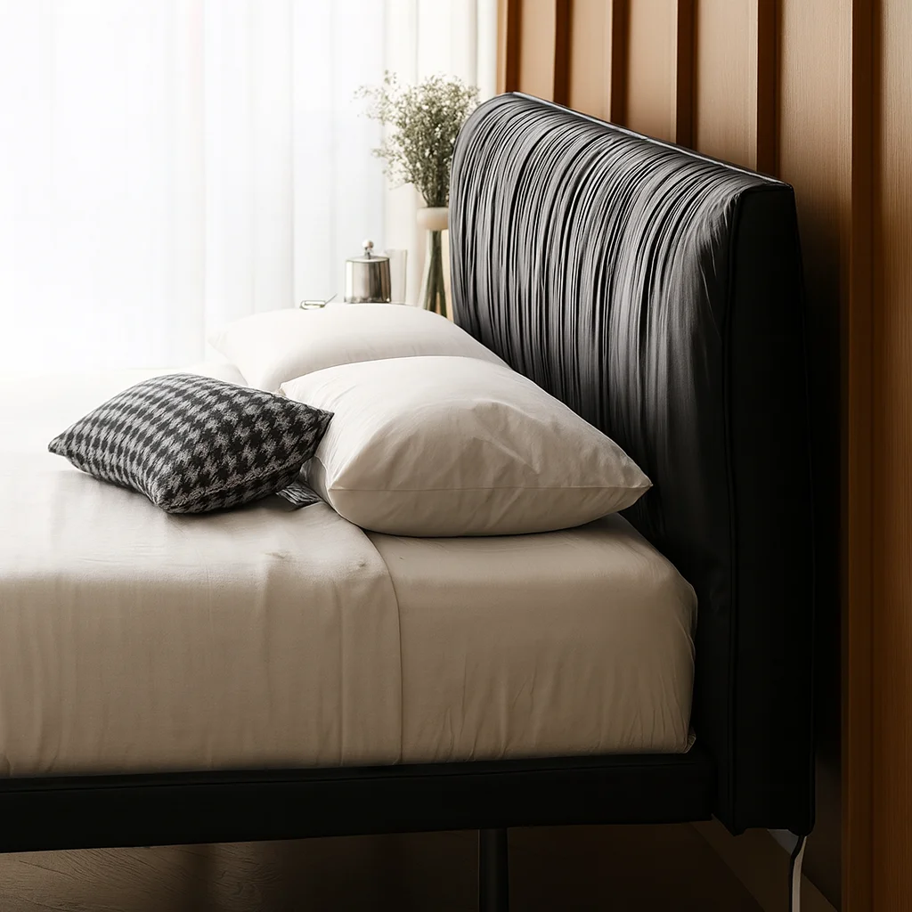 Эта кровать сочетает в себе благородные материалы и современную конструкцию. Изголовье обтянуто натуральной кожей и наполнено комбинацией эластичной пены и хлопкового волокна для комфорта и долговечности. Каркас выполнен из российской ели в сочетании с многослойной древесиной класса E0 и усилен металлической основой. Основание из многослойной древесины обеспечивает прочность и устойчивость, а металлические ножки придают лёгкость и современный акцент.