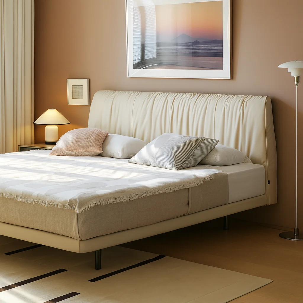 Эта кровать сочетает в себе благородные материалы и современную конструкцию. Изголовье обтянуто натуральной кожей и наполнено комбинацией эластичной пены и хлопкового волокна для комфорта и долговечности. Каркас выполнен из российской ели в сочетании с многослойной древесиной класса E0 и усилен металлической основой. Основание из многослойной древесины обеспечивает прочность и устойчивость, а металлические ножки придают лёгкость и современный акцент.
