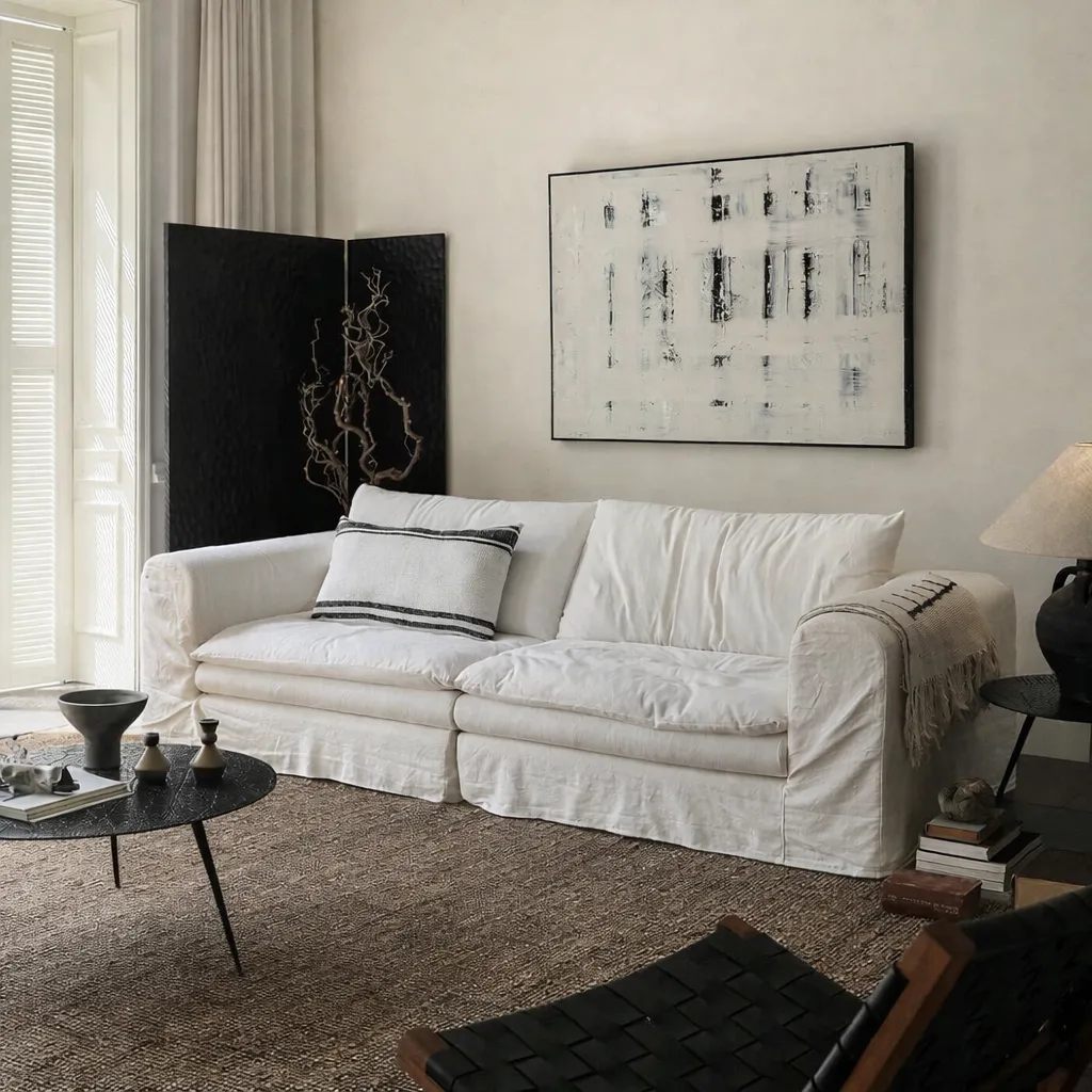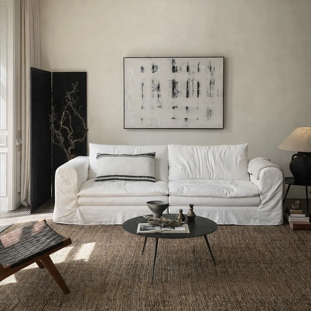 Мягкие линии и глубокие подушки создают ощущение расслабленного покоя, будто облако приняло форму предмета. Лёгкая небрежность складок придаёт естественность, а тканевая текстура с матовым светопоглощением добавляет уют и теплоту. Всё в этом образе говорит о домашнем комфорте, свободе и безмятежности.