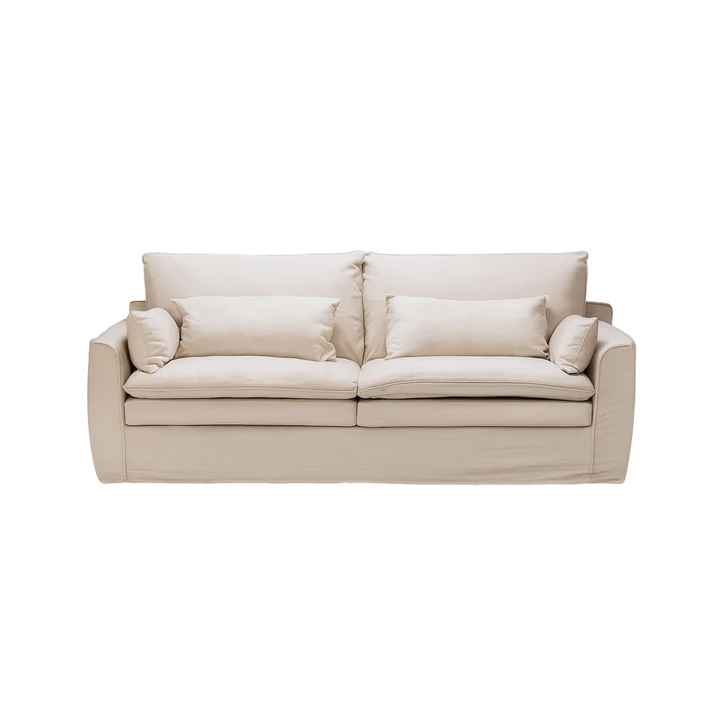 Мягкие линии и глубокие подушки создают ощущение расслабленного покоя, будто облако приняло форму предмета. Лёгкая небрежность складок придаёт естественность, а тканевая текстура с матовым светопоглощением добавляет уют и теплоту. Всё в этом образе говорит о домашнем комфорте, свободе и безмятежности.