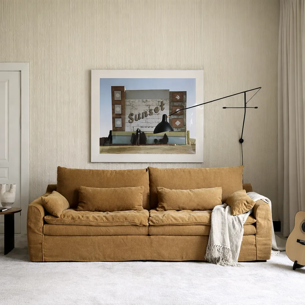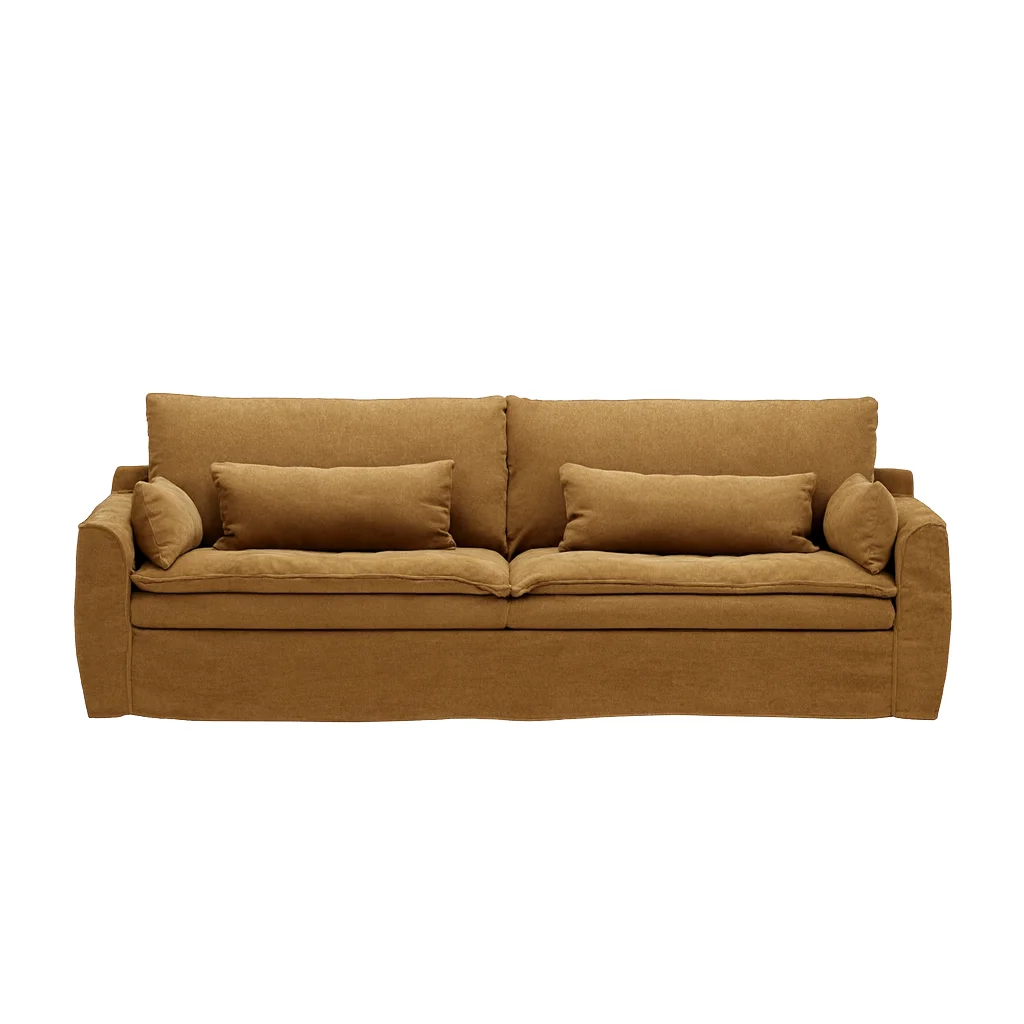 Мягкие линии и глубокие подушки создают ощущение расслабленного покоя, будто облако приняло форму предмета. Лёгкая небрежность складок придаёт естественность, а тканевая текстура с матовым светопоглощением добавляет уют и теплоту. Всё в этом образе говорит о домашнем комфорте, свободе и безмятежности.