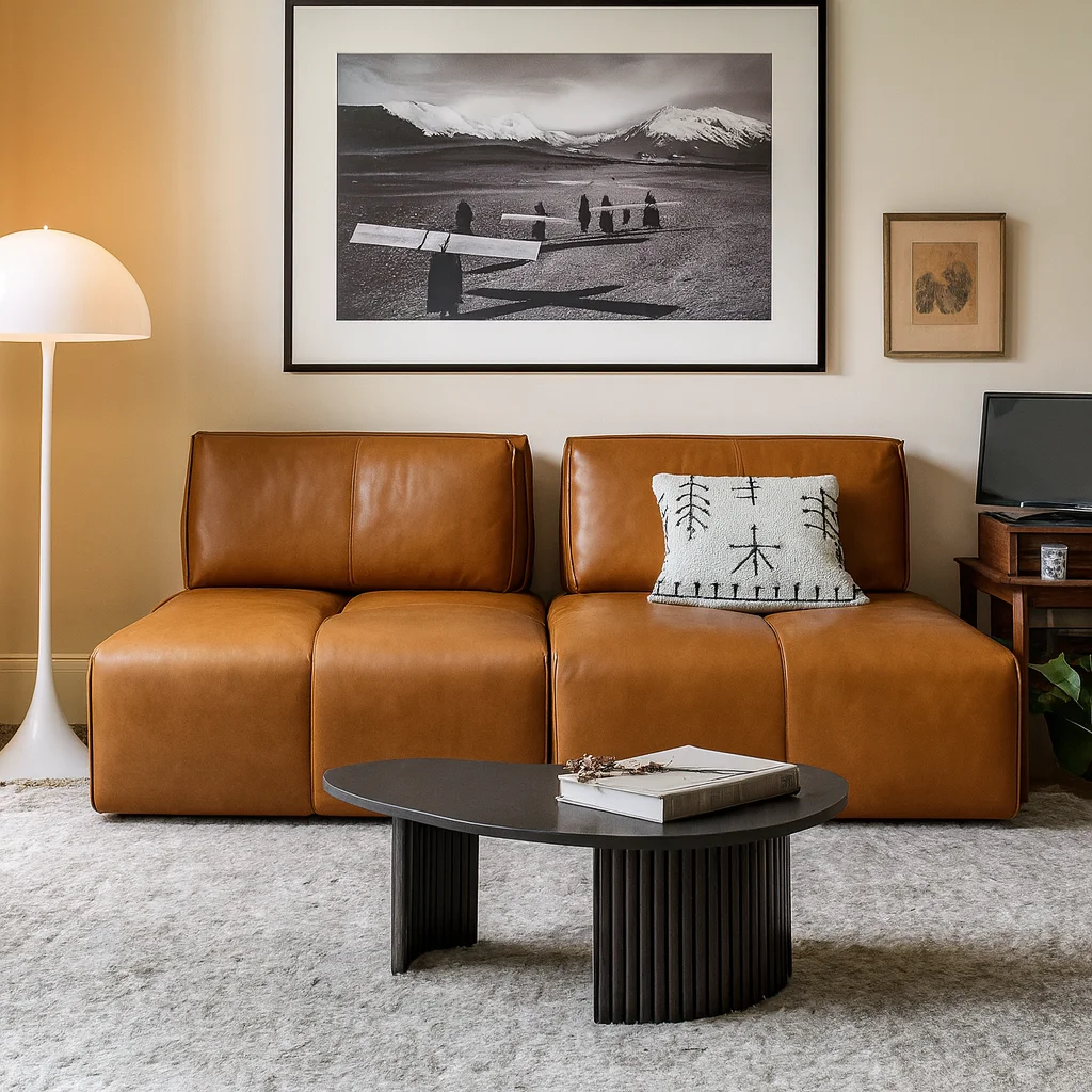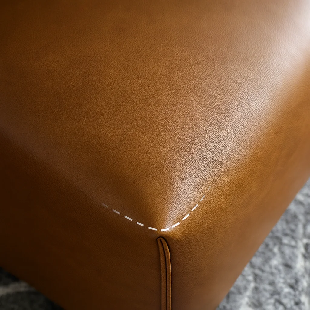 Чёткая геометрия и массивные пропорции сочетаются с мягкостью кожи, создавая образ современного уюта с индустриальным оттенком. Плавно изогнутая спинка и крупные сиденья формируют ощущение монолитного комфорта. Поверхность из натуральной кожи со временем приобретает благородный матовый блеск, добавляя изделию характер и глубину.