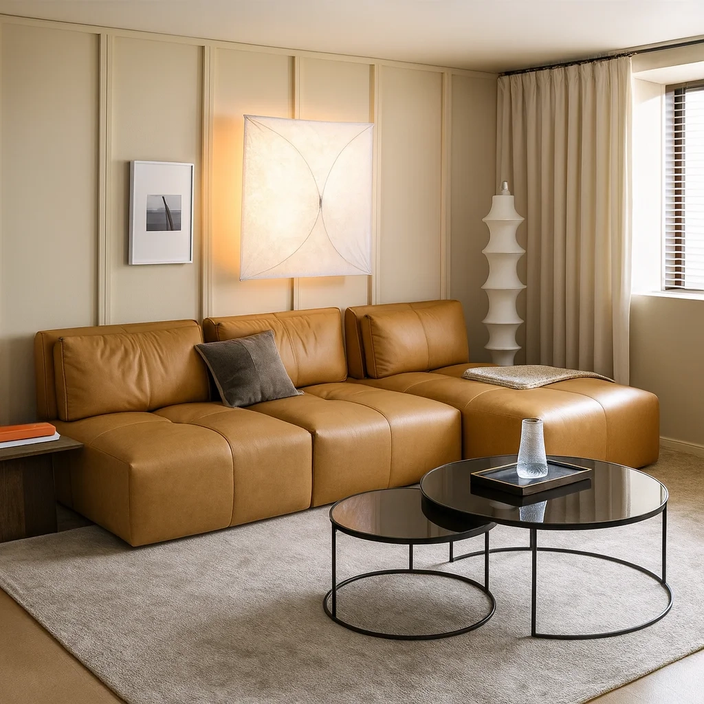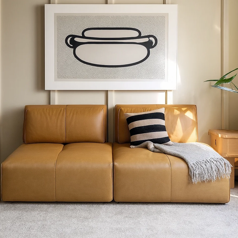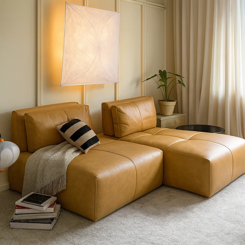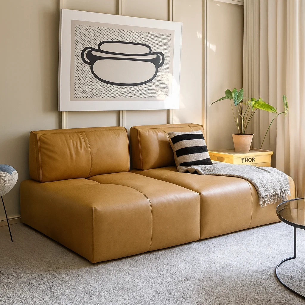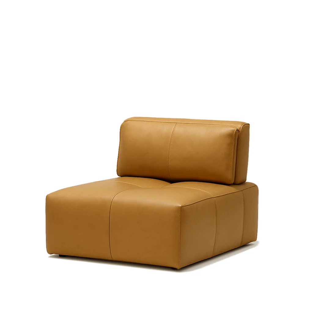 Чёткая геометрия и массивные пропорции сочетаются с мягкостью кожи, создавая образ современного уюта с индустриальным оттенком. Плавно изогнутая спинка и крупные сиденья формируют ощущение монолитного комфорта. Поверхность из натуральной кожи со временем приобретает благородный матовый блеск, добавляя изделию характер и глубину.