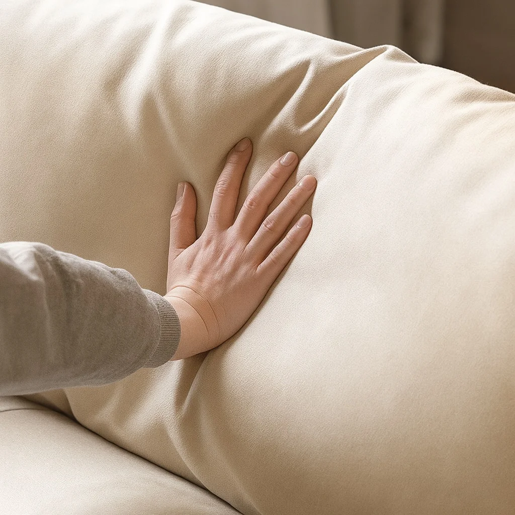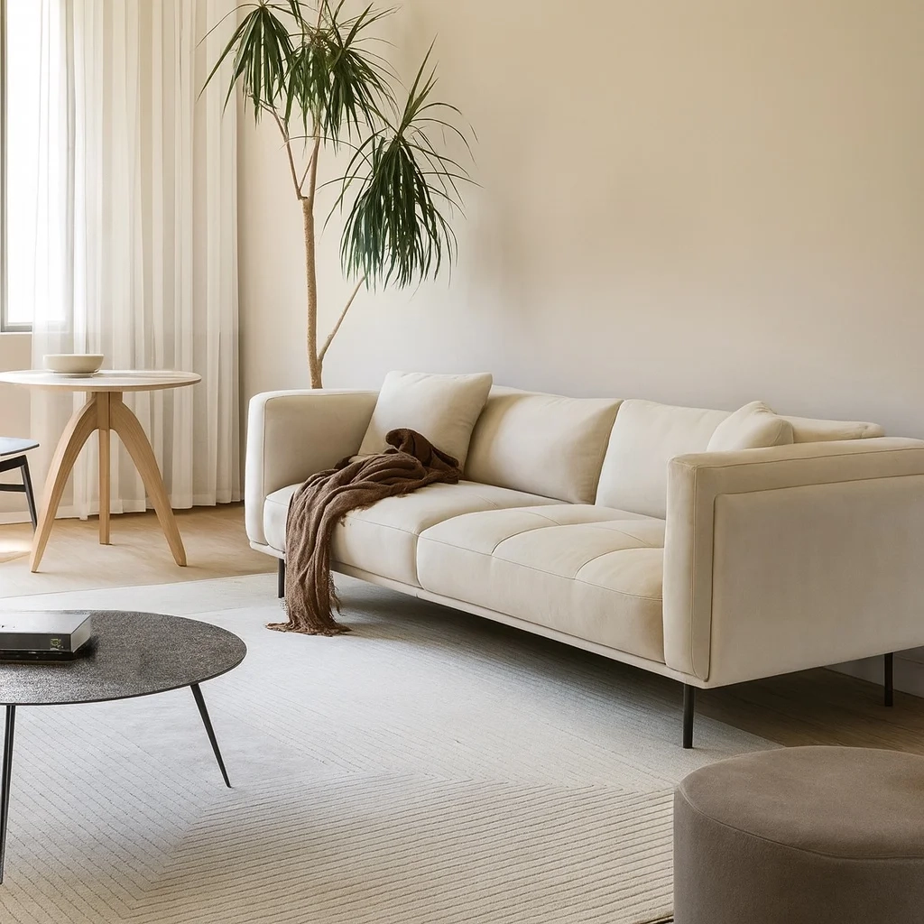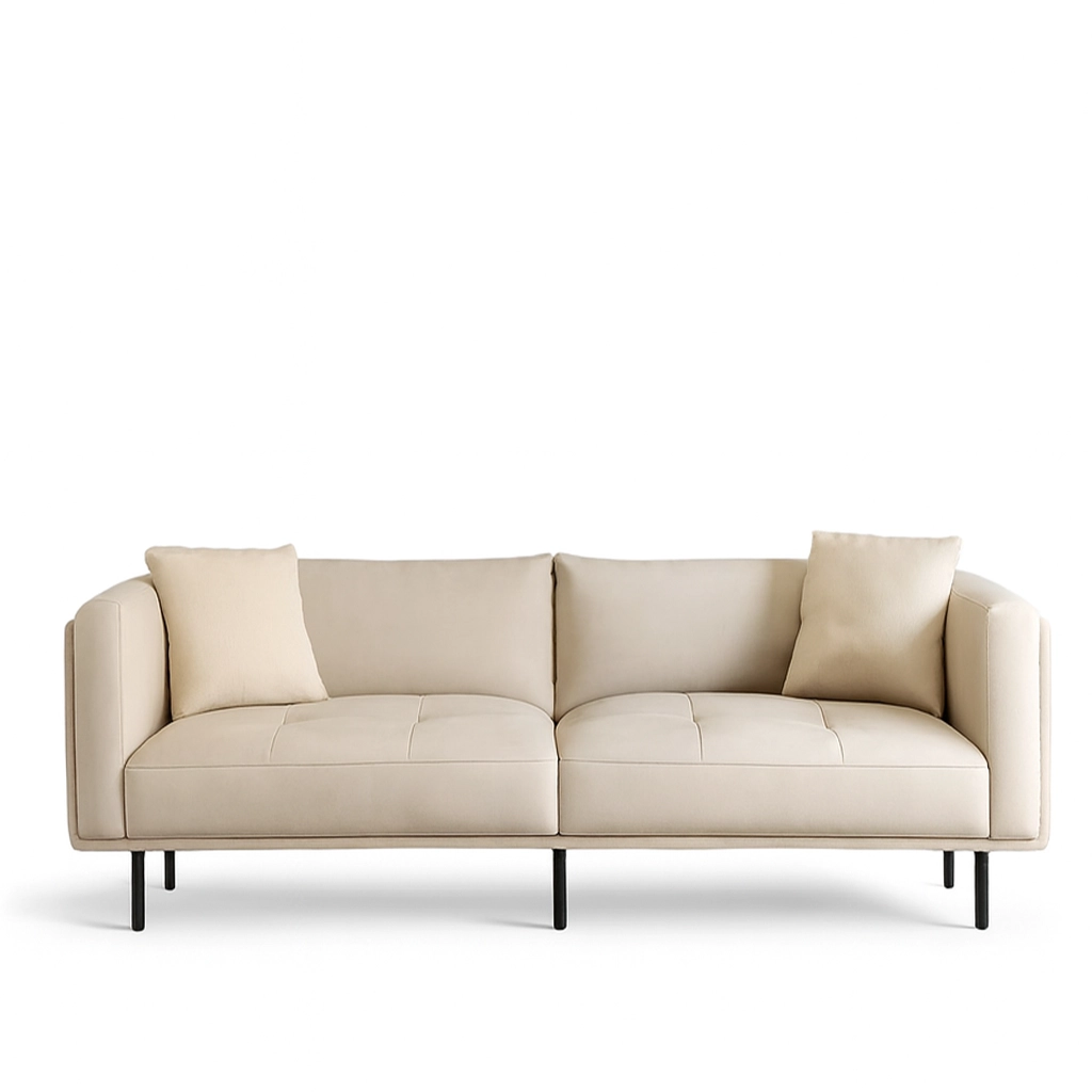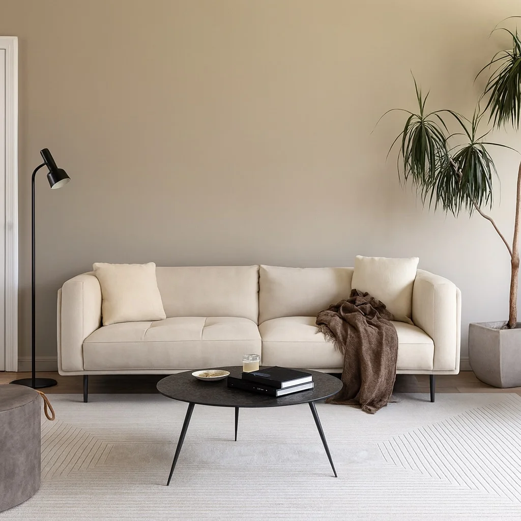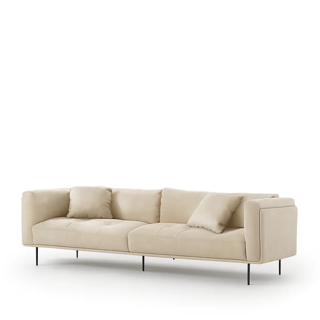 Лаконичная форма и тонкие металлические опоры создают ощущение лёгкости и архитектурной точности. Мягкие подушки в сочетании с чётким силуэтом придают композиции сбалансированную элегантность. Тканевая поверхность с деликатным матовым свечением рождает ощущение свежести и комфорта, будто свет скользит по поверхности утреннего кофе с молоком.