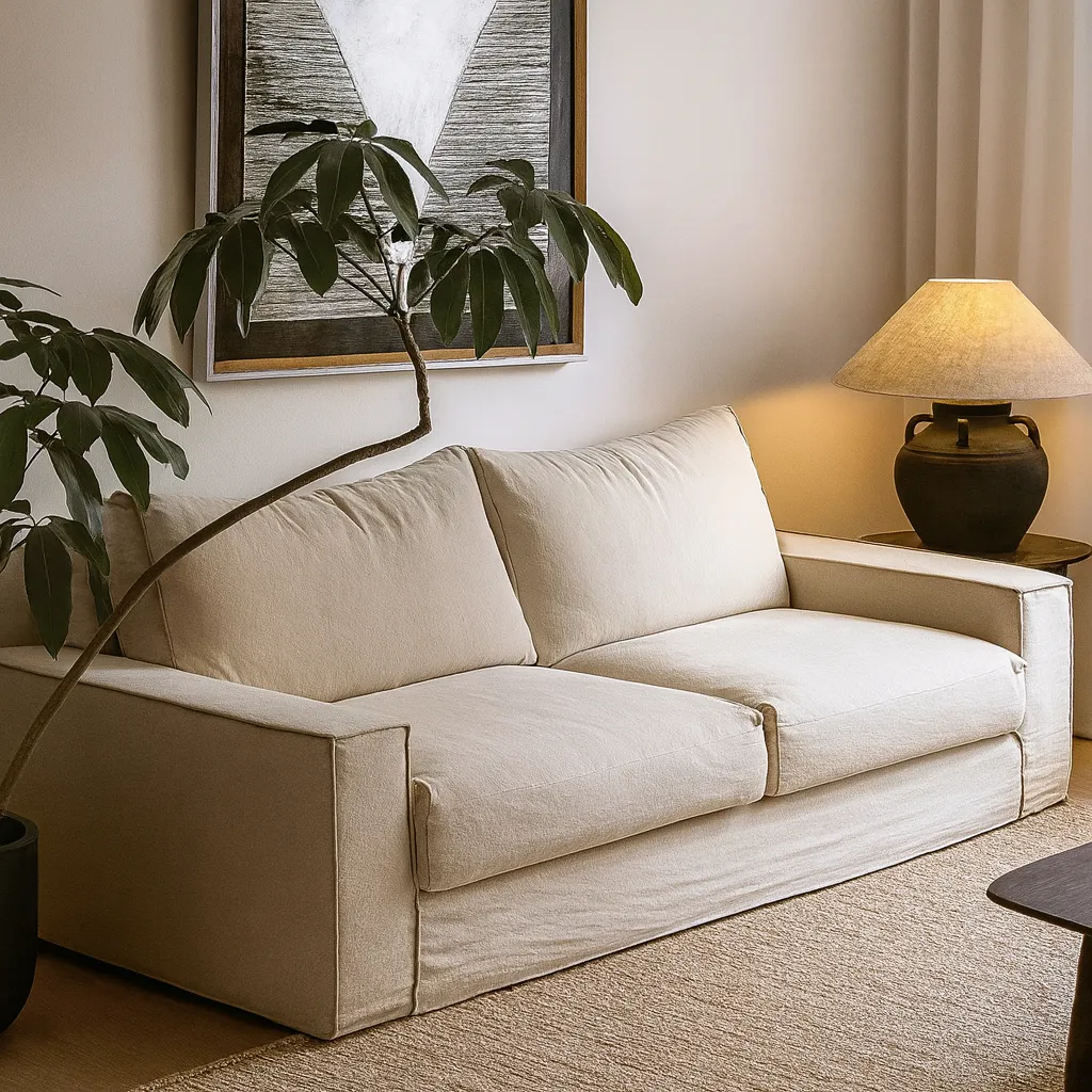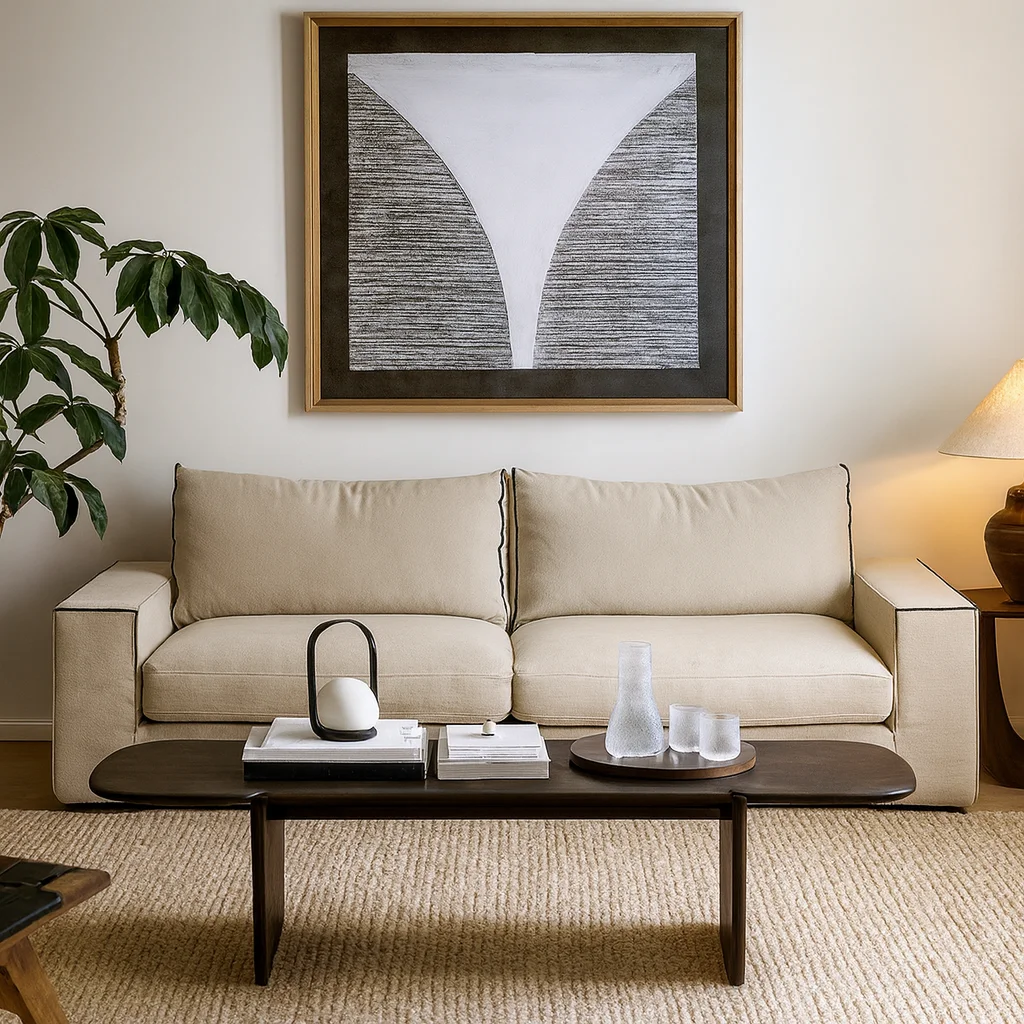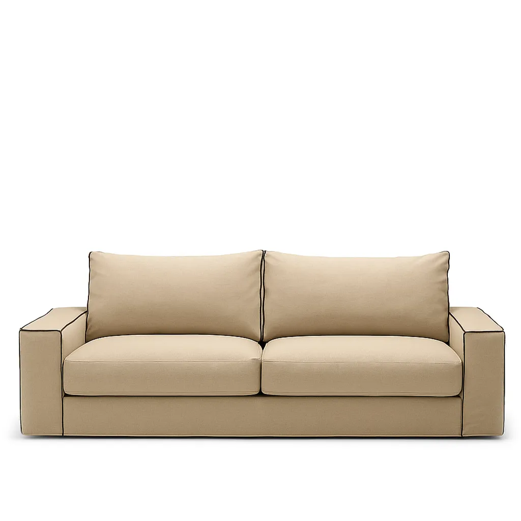 Свободная форма и выразительный контраст канта придают изделию архитектурную чёткость, сохраняя при этом мягкость и уют. Глубокие подушки и широкие подлокотники создают атмосферу расслабленного равновесия, в которой простота формы сочетается с вниманием к пропорциям и текстуре ткани.