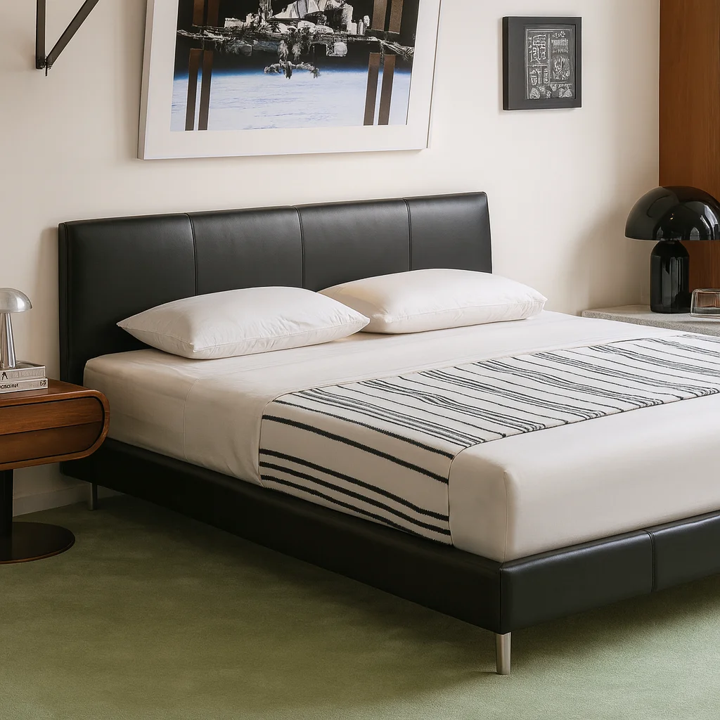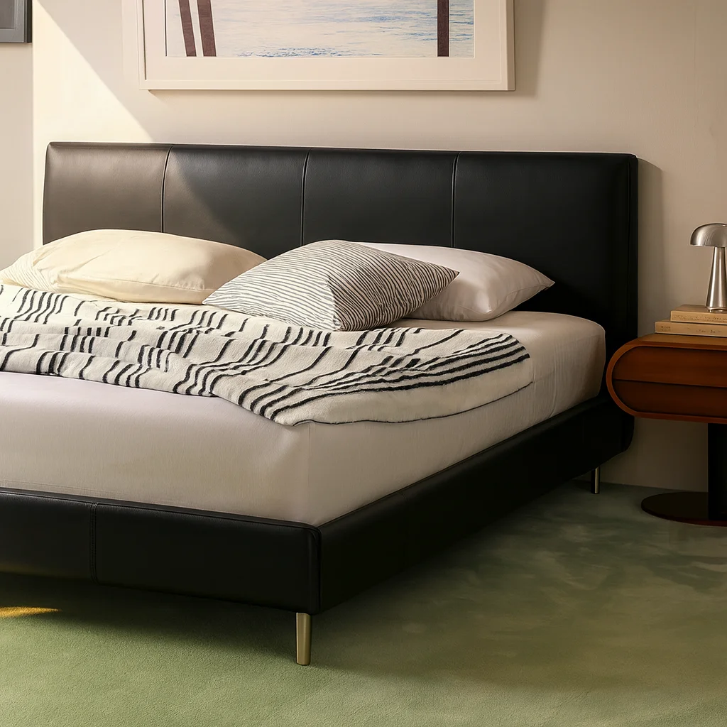 Эта кровать создана для тех, кто ценит сочетание эстетики и надёжности. Изголовье выполнено из натуральной лицевой кожи с благородной текстурой, что придаёт изделию выразительность и комфорт. Каркас сочетает финскую сосну, многослойную древесину класса Е0 и металлическое основание, обеспечивая прочность и долговечность. В конструкции использованы технологичные материалы — от многослойных панелей до противоскользящей ткани, что гарантирует удобство и стабильность в использовании. Лаконичные металлические или нержавеющие ножки подчёркивают современный характер модели.
