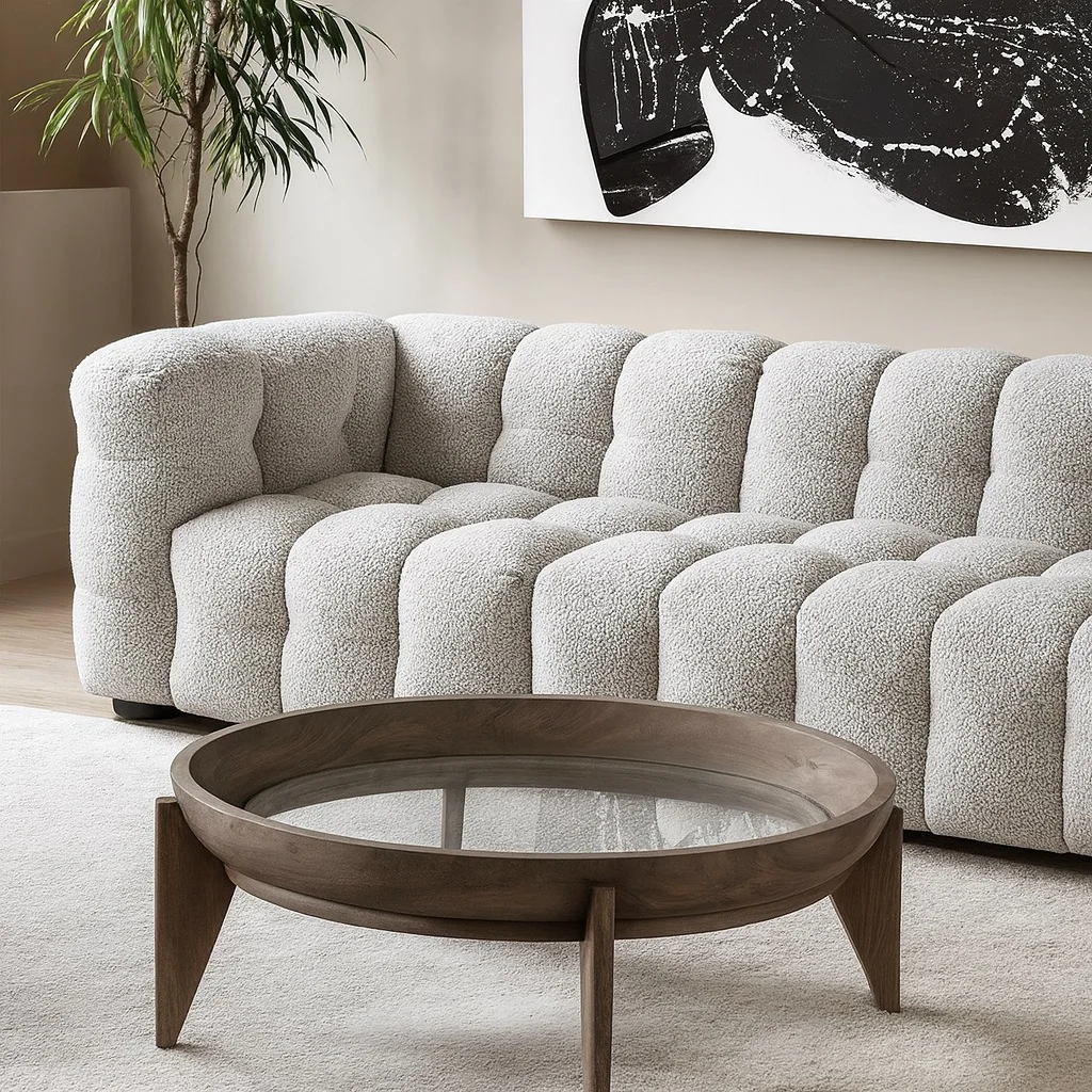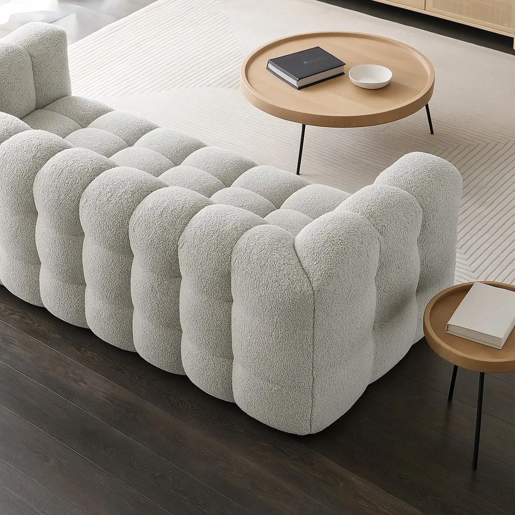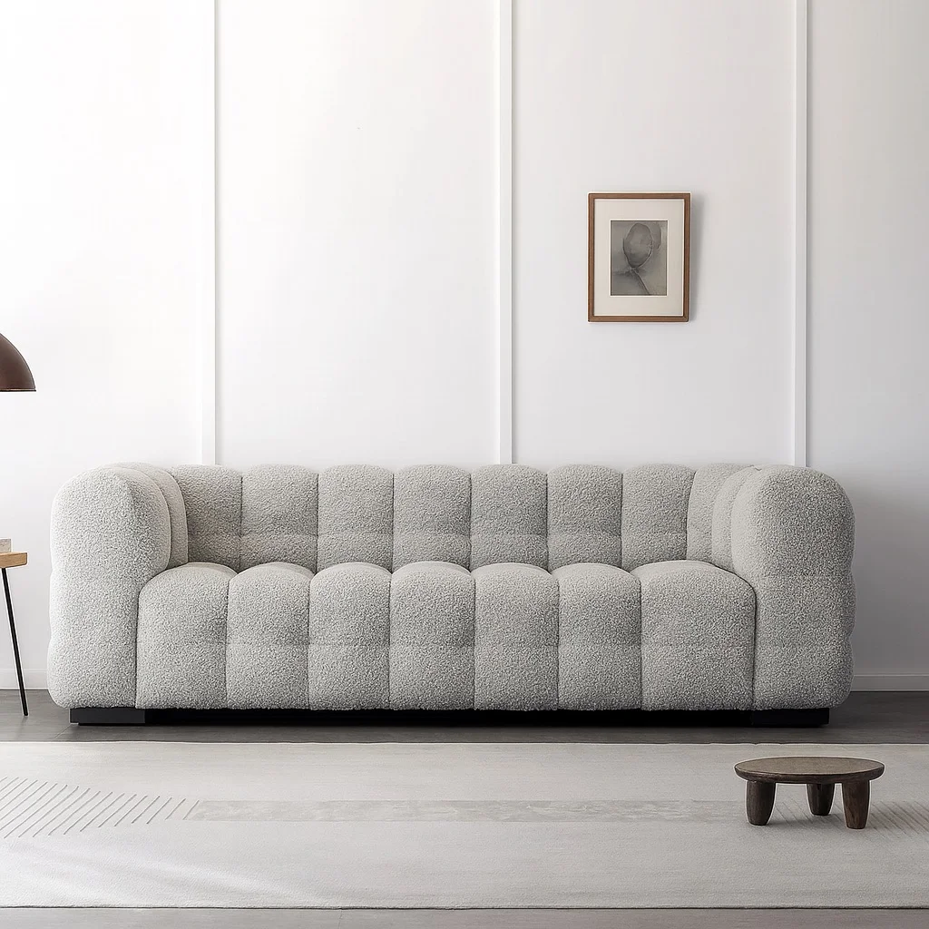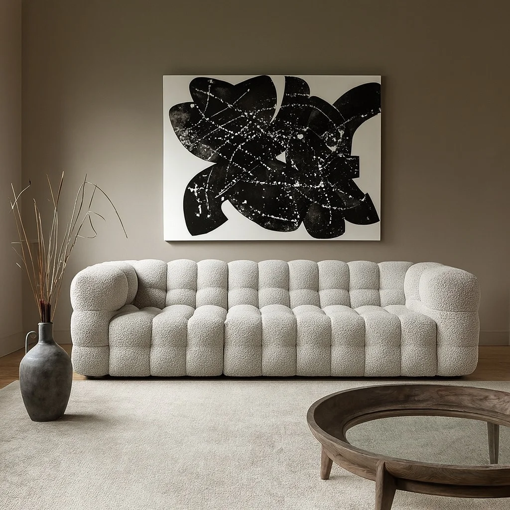 Объёмная форма с мягкой ритмичной простёжкой создаёт эффект глубины и визуальной плотности. Этот образ сочетает современную графичность и чувственную мягкость, словно облако, застывшее в геометрии. Тактильная фактура ткани подчёркивает игру света и тени, превращая изделие в доминанту пространства — выразительную и при этом уютную.