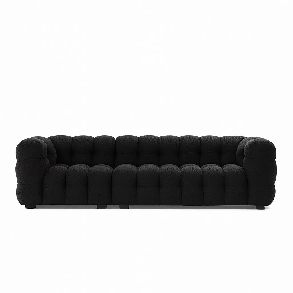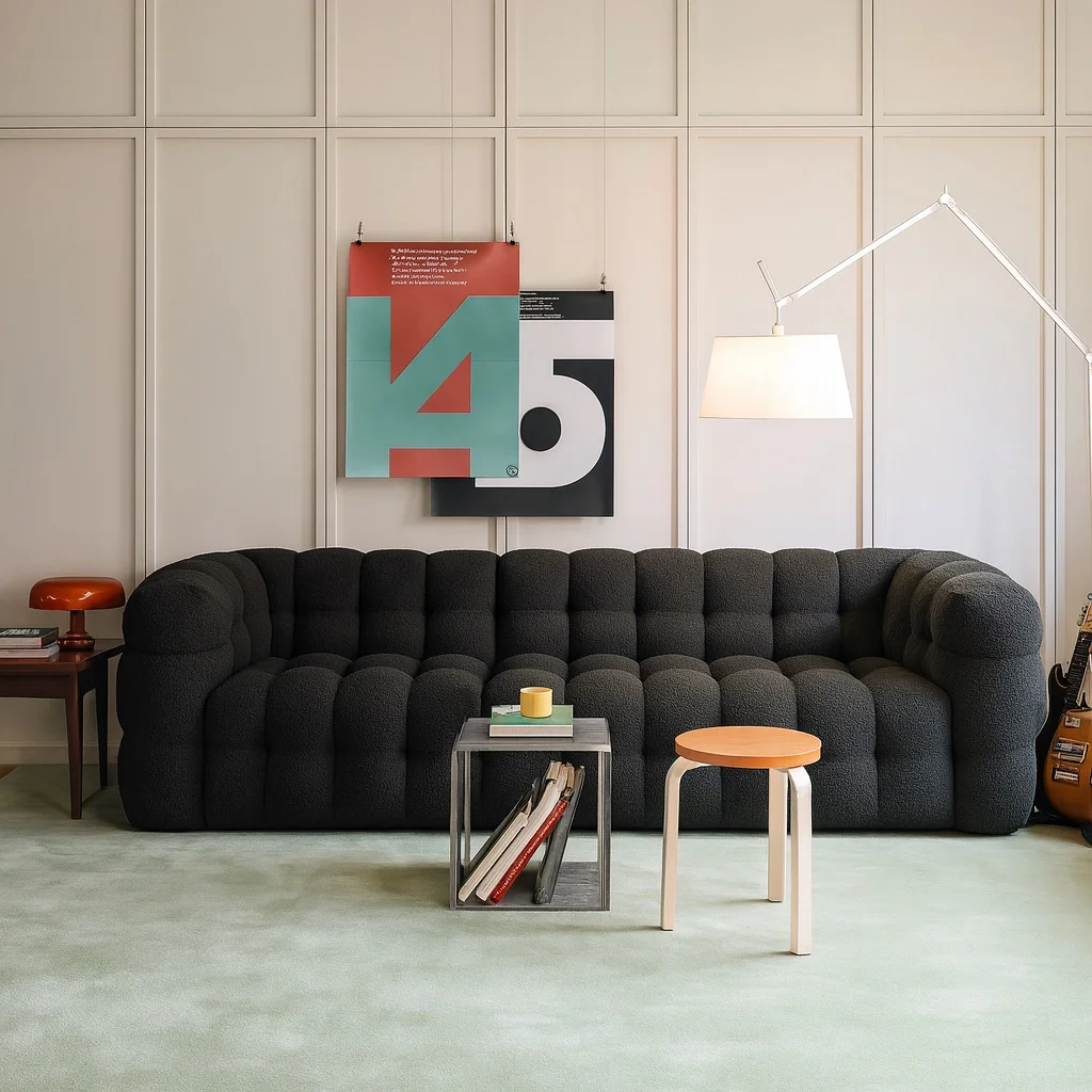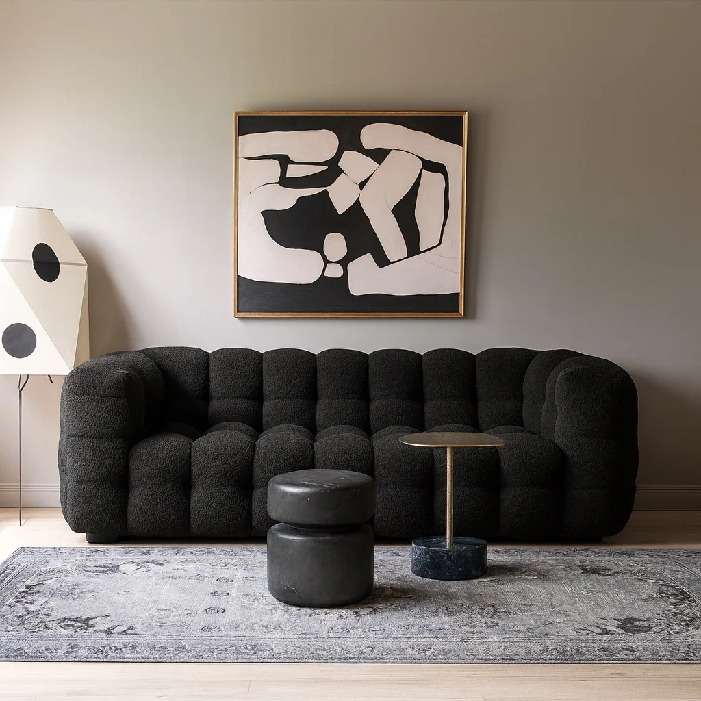 Объёмная форма с мягкой ритмичной простёжкой создаёт эффект глубины и визуальной плотности. Этот образ сочетает современную графичность и чувственную мягкость, словно облако, застывшее в геометрии. Тактильная фактура ткани подчёркивает игру света и тени, превращая изделие в доминанту пространства — выразительную и при этом уютную.