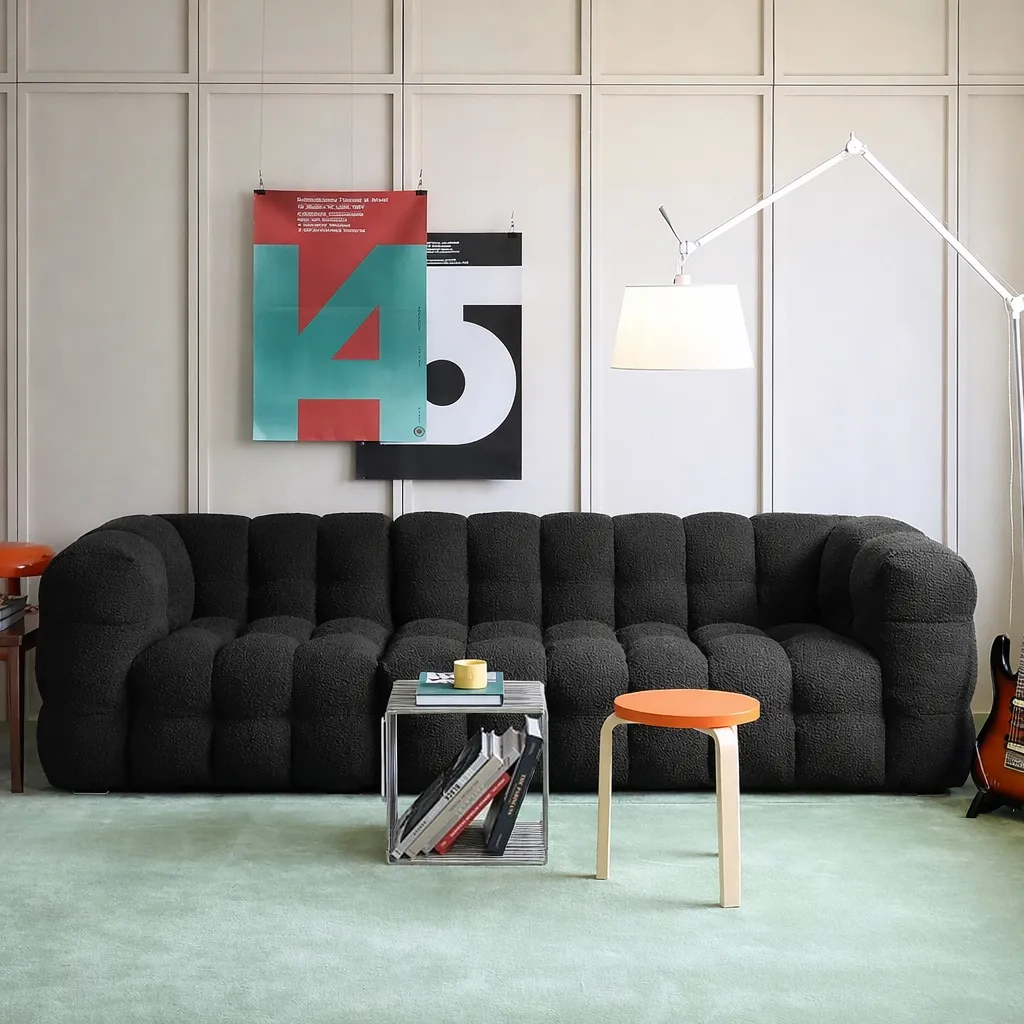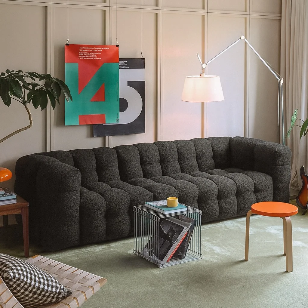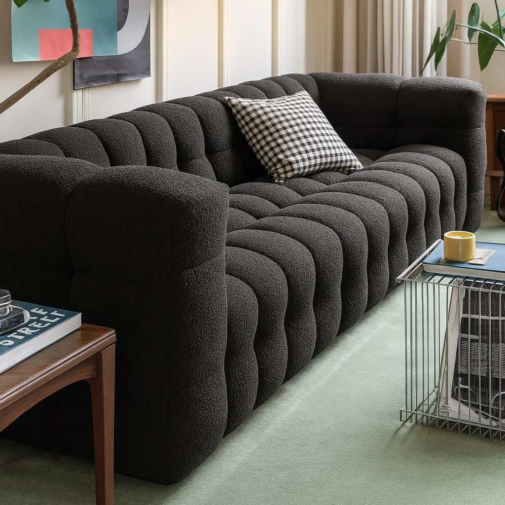 Объёмная форма с мягкой ритмичной простёжкой создаёт эффект глубины и визуальной плотности. Этот образ сочетает современную графичность и чувственную мягкость, словно облако, застывшее в геометрии. Тактильная фактура ткани подчёркивает игру света и тени, превращая изделие в доминанту пространства — выразительную и при этом уютную.
