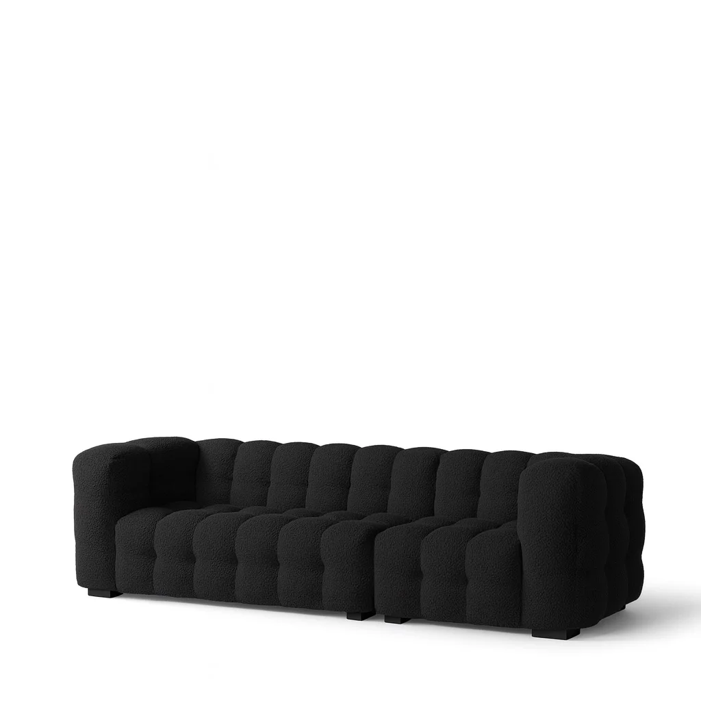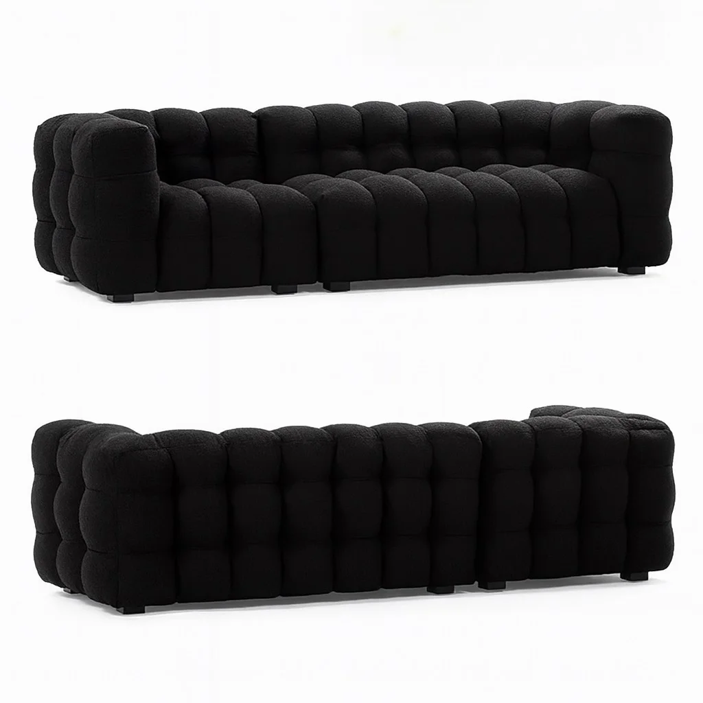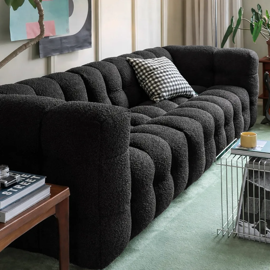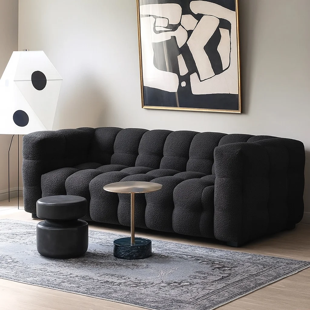 Объёмная форма с мягкой ритмичной простёжкой создаёт эффект глубины и визуальной плотности. Этот образ сочетает современную графичность и чувственную мягкость, словно облако, застывшее в геометрии. Тактильная фактура ткани подчёркивает игру света и тени, превращая изделие в доминанту пространства — выразительную и при этом уютную.