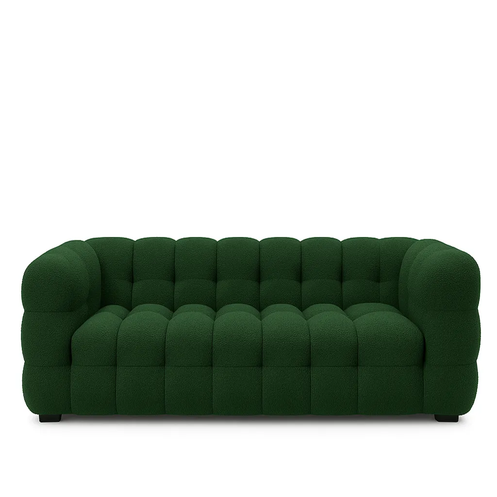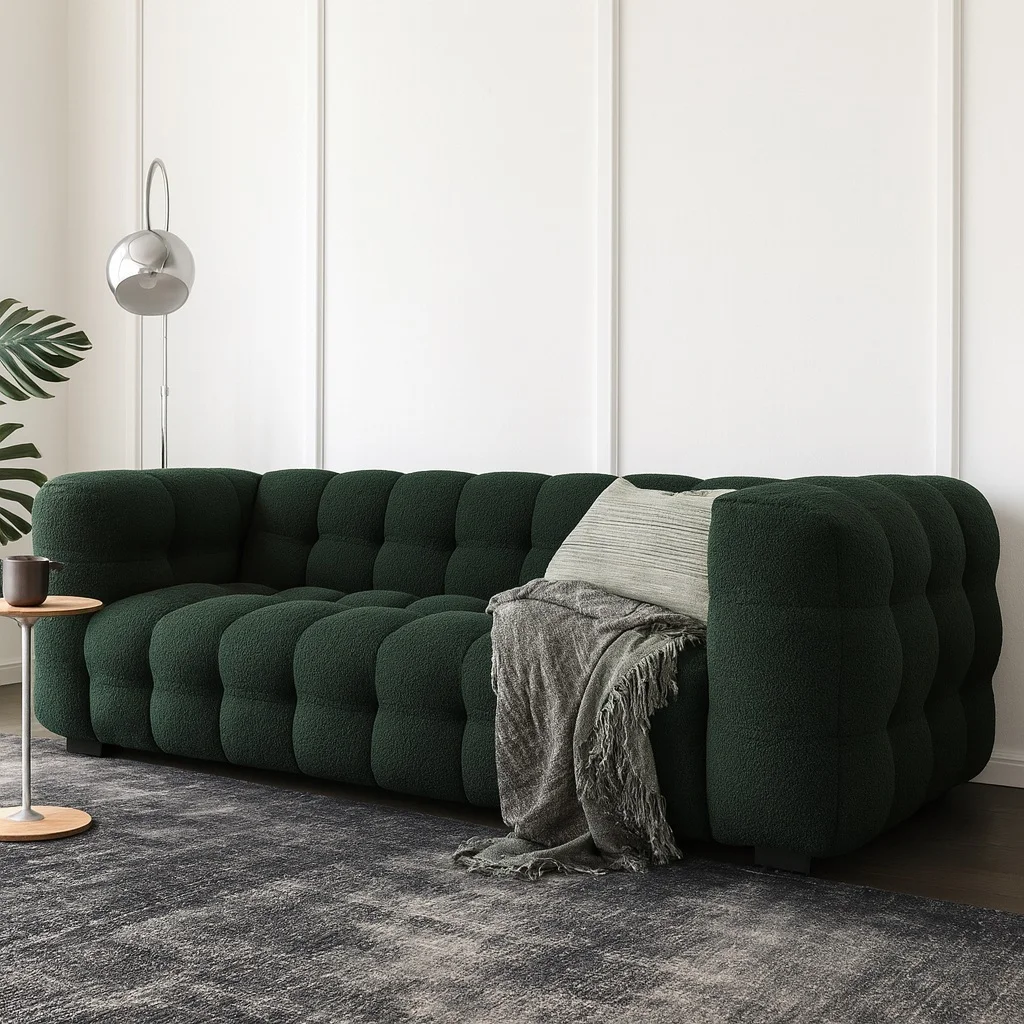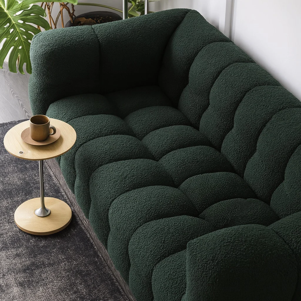 Объёмная форма с мягкой ритмичной простёжкой создаёт эффект глубины и визуальной плотности. Этот образ сочетает современную графичность и чувственную мягкость, словно облако, застывшее в геометрии. Тактильная фактура ткани подчёркивает игру света и тени, превращая изделие в доминанту пространства — выразительную и при этом уютную.