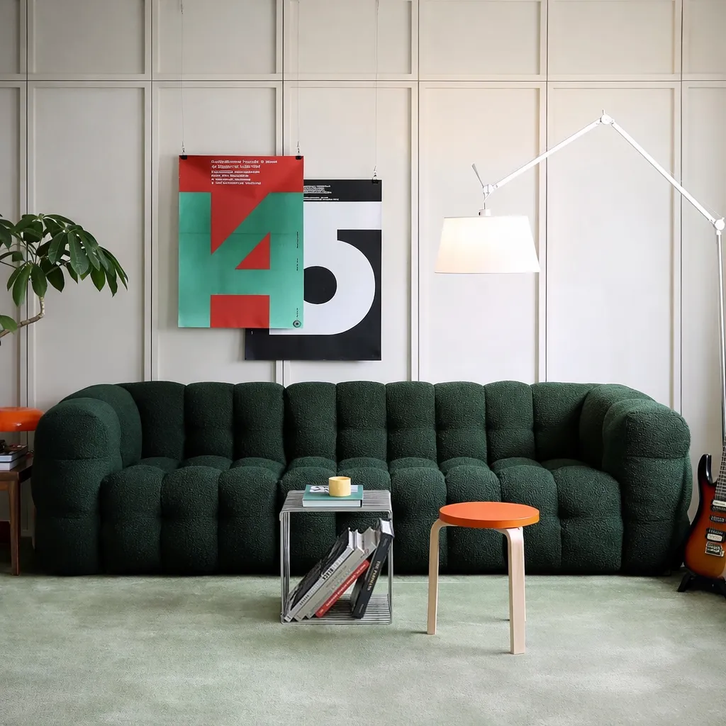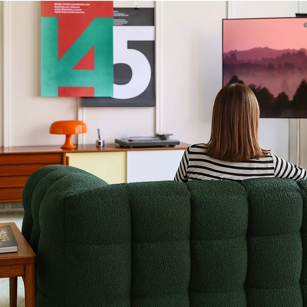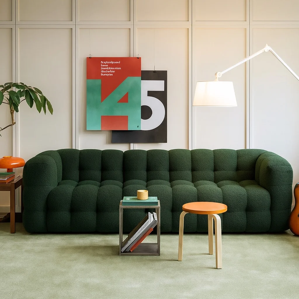 Объёмная форма с мягкой ритмичной простёжкой создаёт эффект глубины и визуальной плотности. Этот образ сочетает современную графичность и чувственную мягкость, словно облако, застывшее в геометрии. Тактильная фактура ткани подчёркивает игру света и тени, превращая изделие в доминанту пространства — выразительную и при этом уютную.