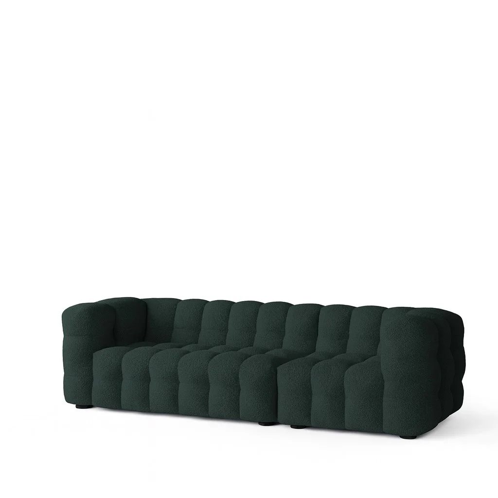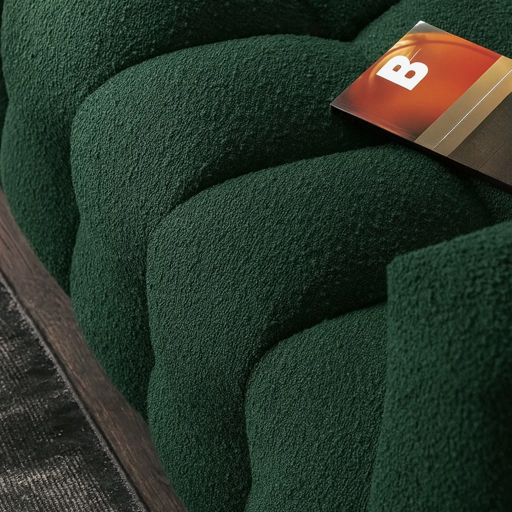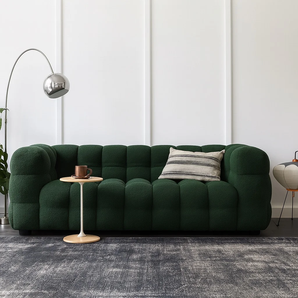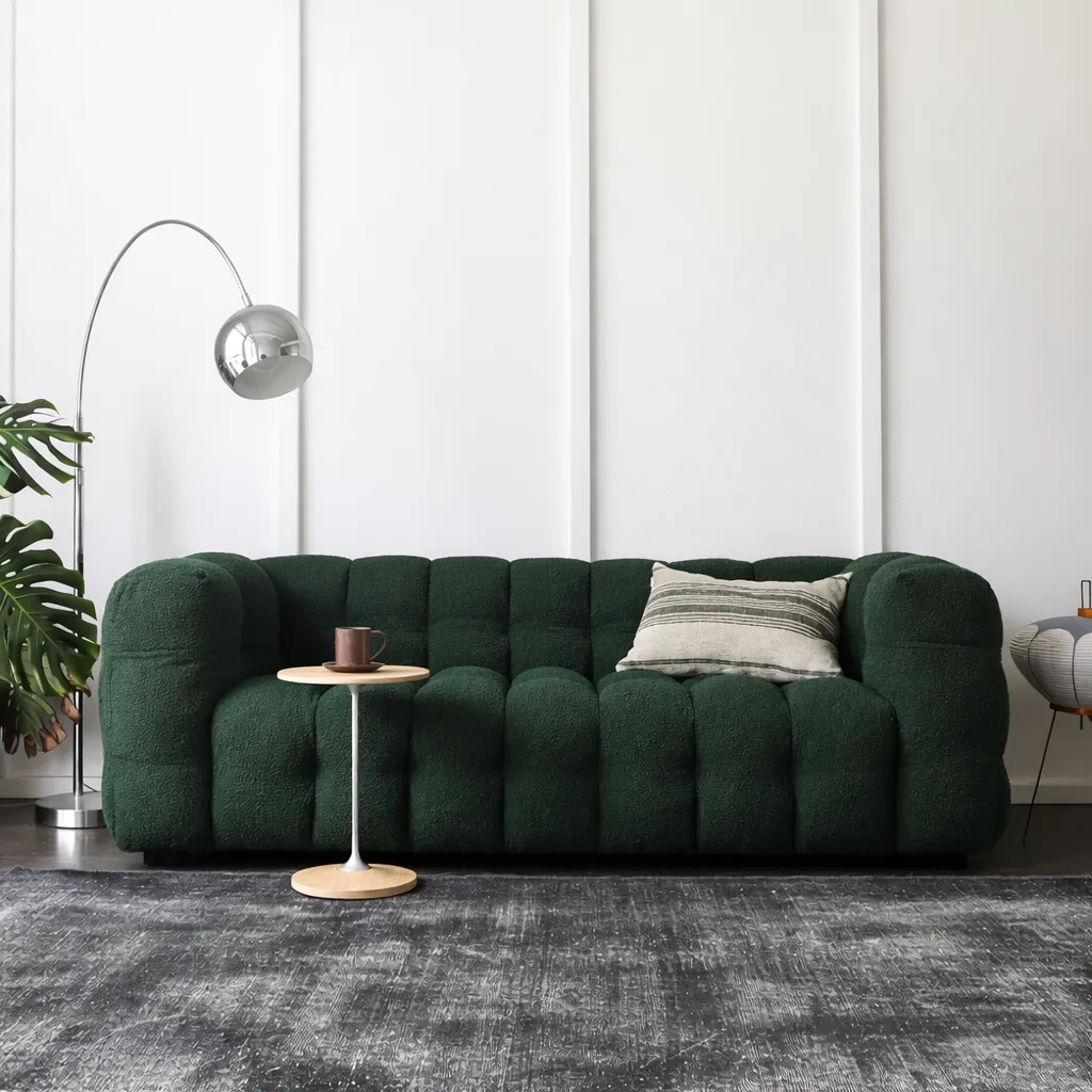 Объёмная форма с мягкой ритмичной простёжкой создаёт эффект глубины и визуальной плотности. Этот образ сочетает современную графичность и чувственную мягкость, словно облако, застывшее в геометрии. Тактильная фактура ткани подчёркивает игру света и тени, превращая изделие в доминанту пространства — выразительную и при этом уютную.