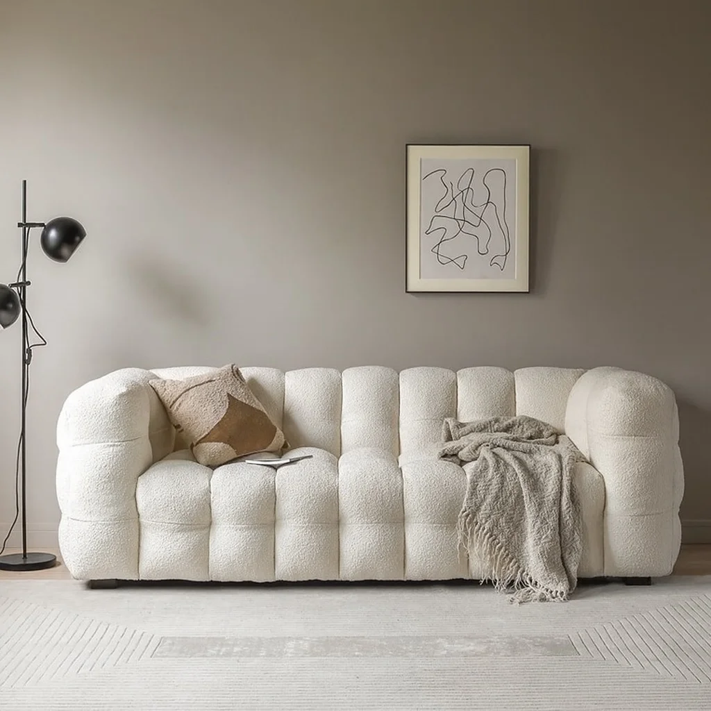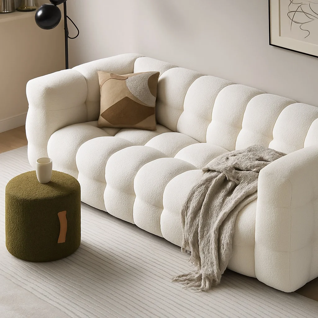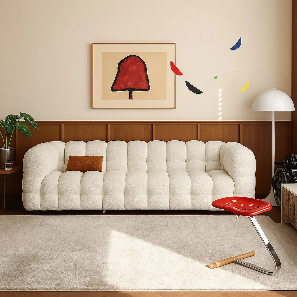 Объёмная форма с мягкой ритмичной простёжкой создаёт эффект глубины и визуальной плотности. Этот образ сочетает современную графичность и чувственную мягкость, словно облако, застывшее в геометрии. Тактильная фактура ткани подчёркивает игру света и тени, превращая изделие в доминанту пространства — выразительную и при этом уютную.