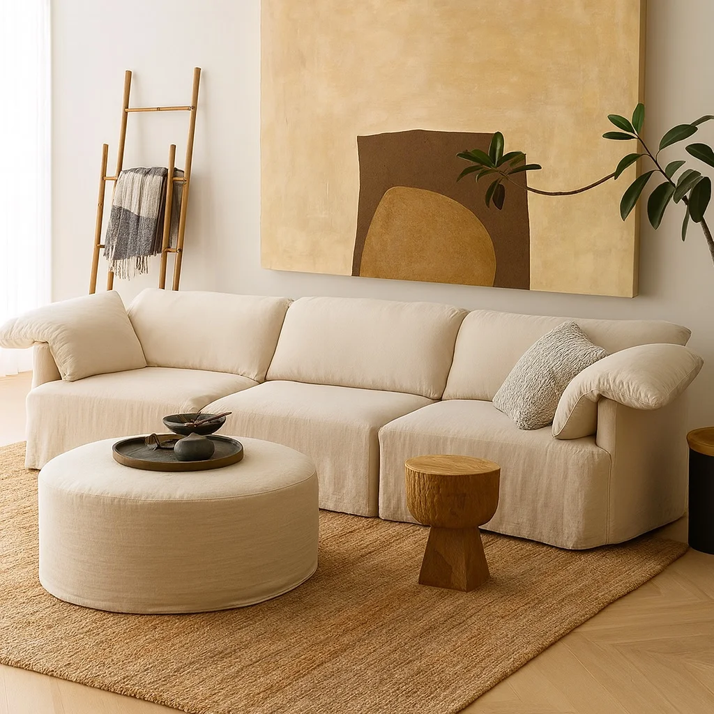 Объёмная форма с мягко изломанными подлокотниками создаёт ощущение расслабленного равновесия. Хлопково-льняная текстура передаёт природную теплоту, а глубокие подушки формируют визуальную лёгкость и комфорт. Всё в этом образе — от мягкости линий до пропорций — продумано для того, чтобы пространство дышало спокойствием и свободой.