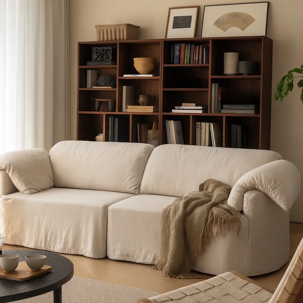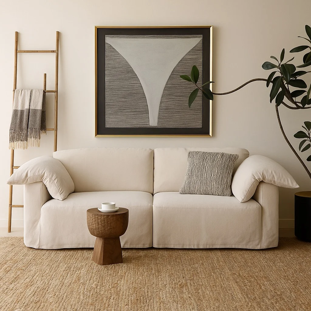 Объёмная форма с мягко изломанными подлокотниками создаёт ощущение расслабленного равновесия. Хлопково-льняная текстура передаёт природную теплоту, а глубокие подушки формируют визуальную лёгкость и комфорт. Всё в этом образе — от мягкости линий до пропорций — продумано для того, чтобы пространство дышало спокойствием и свободой.